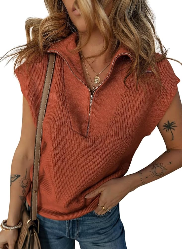Sleeveless V Neck Sweater/Pullover Sweater Tops/Zipper Sweater for Women/V Neckline With Zip/Soft And Lightweight Fabric/Comfy Stretchy Knit Fabric/Short Sleeve/1/4 Zip/Solid Color/Relaxed Loose Fit/For Spring, Fall, Winter,Performance For For Most Figures