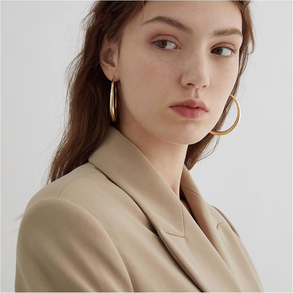 💟【 Lightweight Big Gold Hoop Earrings 】: These simple large gold hoop earrings are lightweight, the bottom is curved thicker and thicker, and the top is thinner and thinner, more refined, simple and elegant. These gold hoops ultra-versatile and go with a variety of looks, perfectly suit your dressing style.This pair of large hoops earrings for women will be the first to catch the eye.