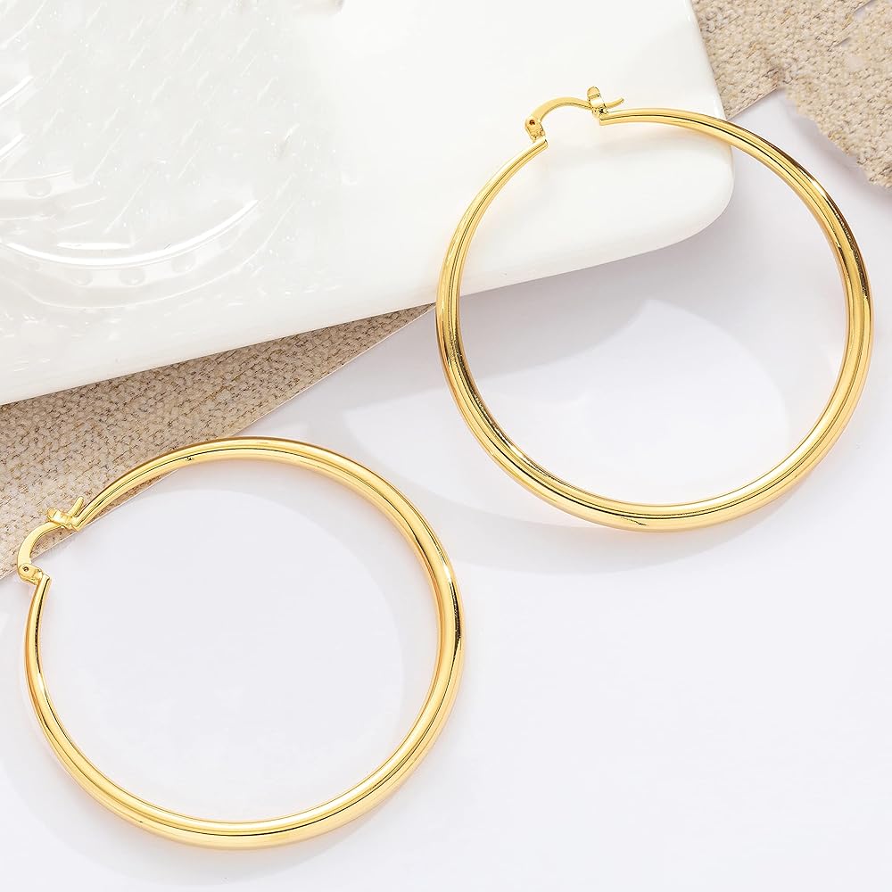 💟【Trendy 14k gold hoop earrings】: The gold hoop earrings 14k real gold have inner diameters :60mm, Weight only 0.08 ounces. Big gold hoop earrings for women are easy to style and perfect for formal occasions or everyday wear, whether you have long or short hair. The first thing your friends will notice when they see it is these large gold hoop earrings, and they will all be attracted by it.The simple and modern design can add more charm to you.