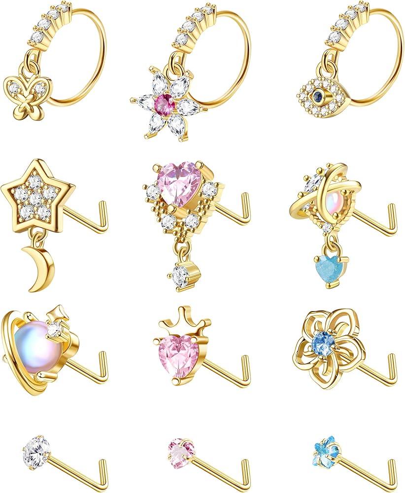 JOERICA 12 Pcs 20G Dangle Nose Rings and Studs for Women - L Shaped Stainless Steel Hoops With Butterfly, Heart, Moon, Flower, Evil Eye, Crown CZ Dangling Piercing Jewelry