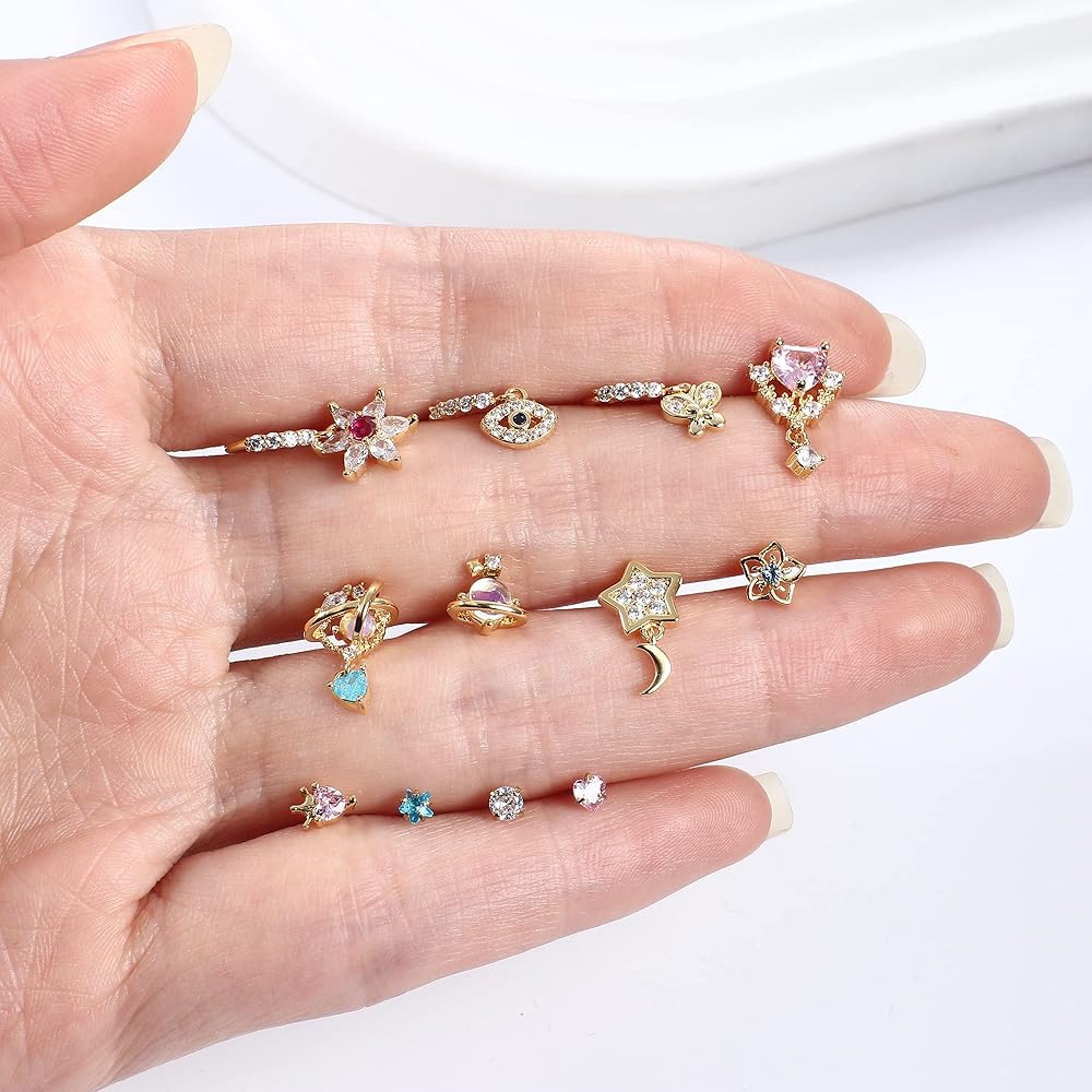 Nose Rings Set -- One order includes 9 pieces dangle nose rings in different styles: evil eye nose stud, butterfly nose ring, moon star nose ring, cz nose ring, heart dangle nose stud, cat nose stud, planet nose stud, ect.