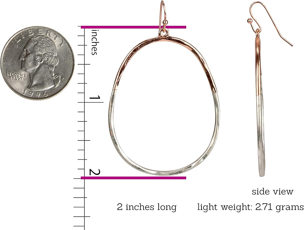 Super light-weight, the 2 hoops turn independently. Total length excluding fishhook is 2 inches long and wide. Each earring is light-weight at 2.43 grams. They come with a pair of rubber ear backs to prevent loss.
