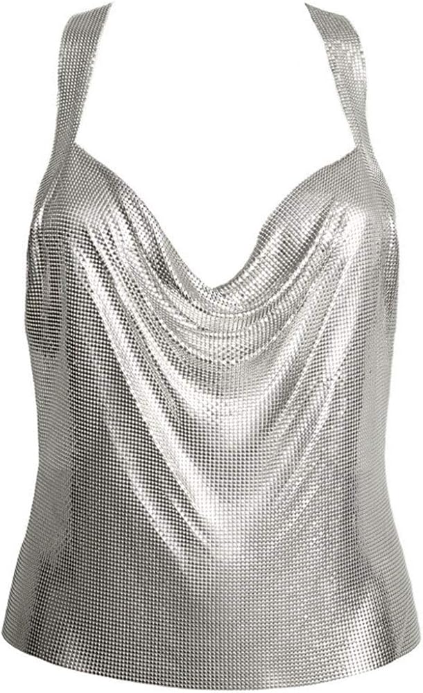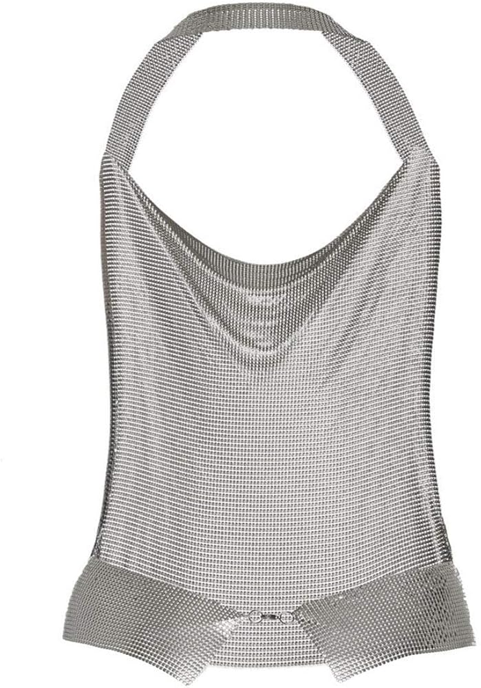 One Size:waist length:90cm/35.4in,shoulder strap length:81cm/31.9in,chest length:33cm/13in.adjustable chain strap,fits all body shape,this is adjustable shirt for women features a deep v neck with adjustable self ties at neck and back to fit most body types.features a smooth metal sequin front that shimmers like chain mail metal whenever the light hits it.