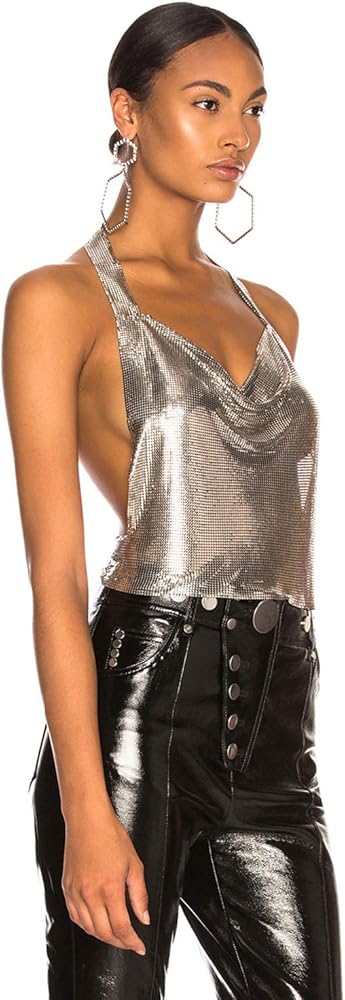 Women Body Chain Sequin Sparkle Silver Bikini Bra Tank V Neck Spaghetti Strap Backless Halter Crop Tops Rave Party Blouse