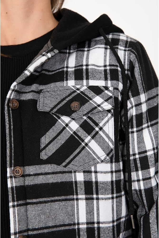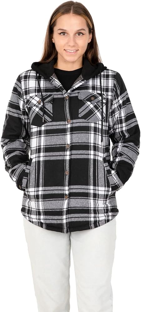 Women Hooded Flannel Shirt: Features full front button down closure,long sleeve plaid flannel shirt,Yarn dyed flannel,two front pocket,two hand pockets,quilted flannel jacket with hood,great for cool weather wear.