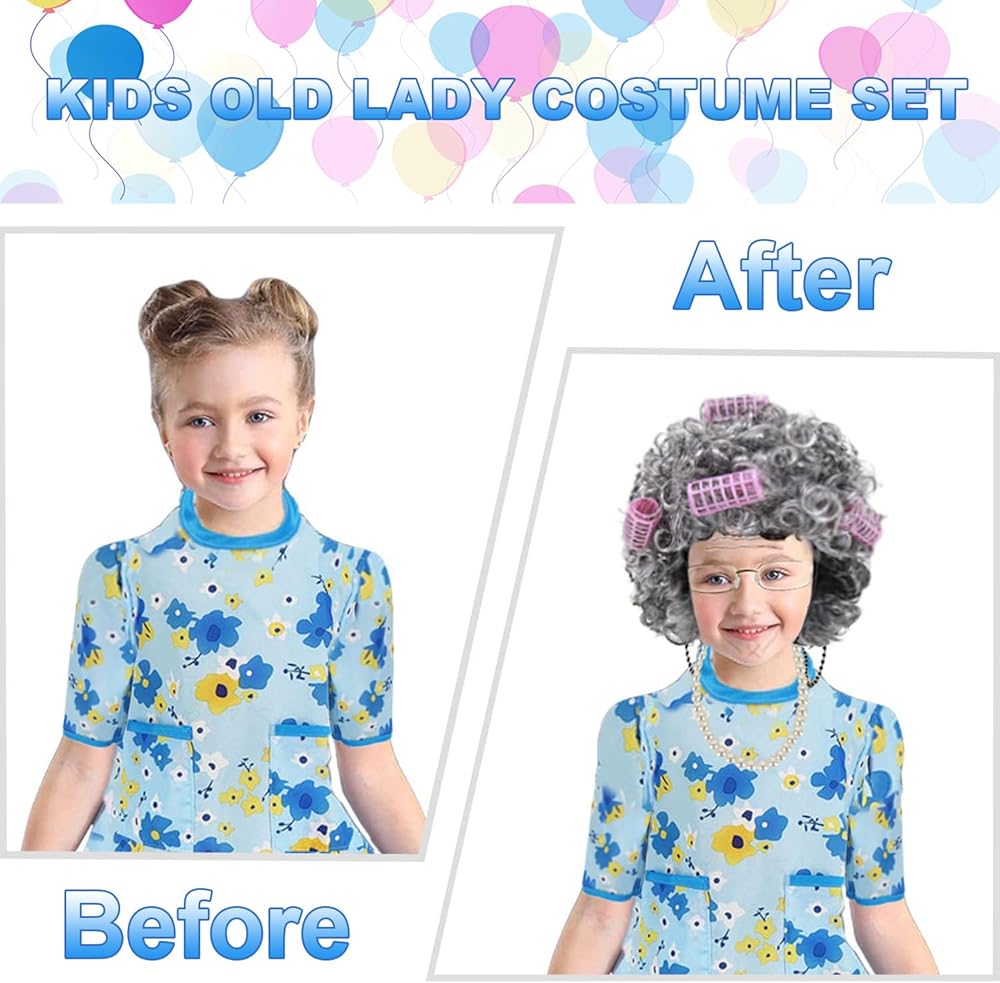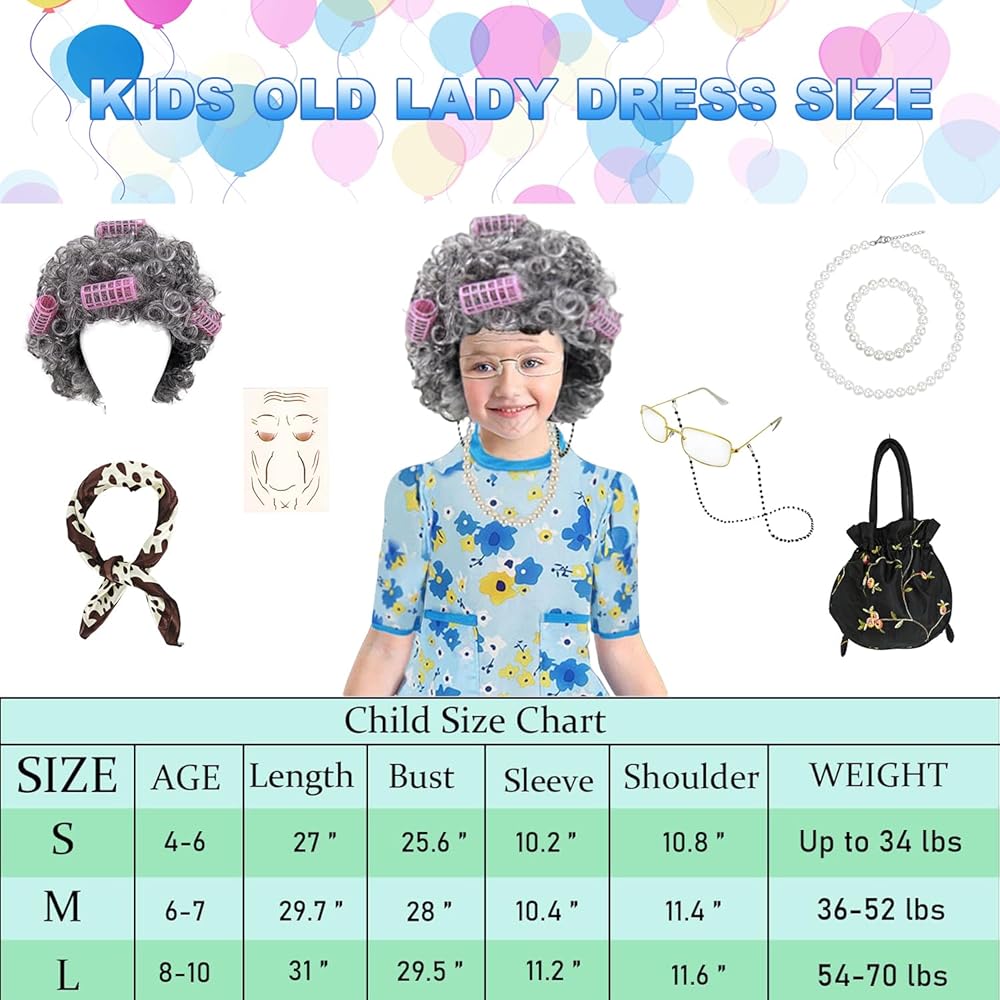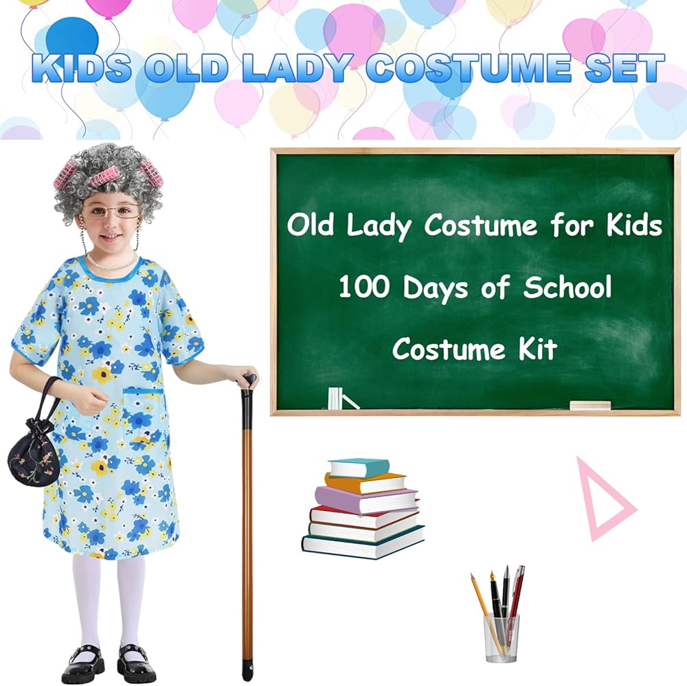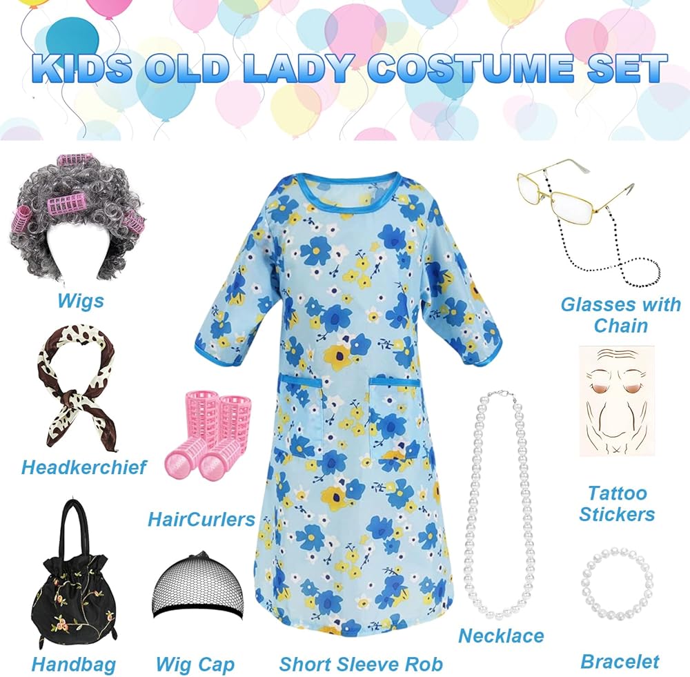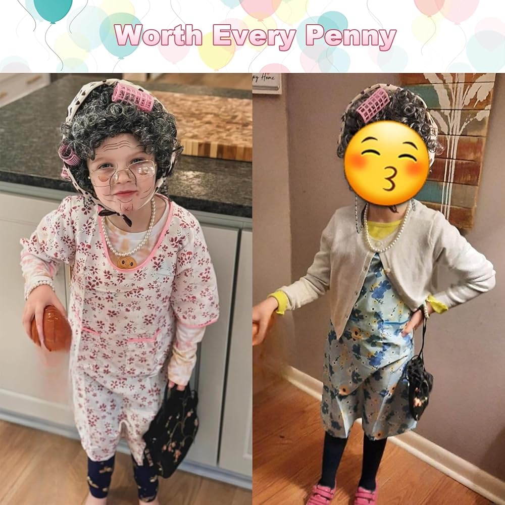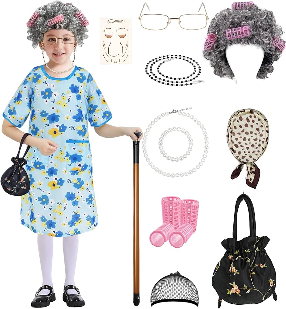 Worth Every Penny: Old lady costume kits includes full accessories for dressing up for 100th day of school costume.Including: Short Sleeve Rob,Granny Wig, Glasses with Chain, Pearl Necklace Bracelet Earrings, Cane, Makeup Tattoo Stickers, HairCurlers, Handbag, Leopard Print Headkerchief, Wig Cap. These accessories immediately brought the era of grandmother. You can complete all the accessories you need in one stop, saving your time and energy.