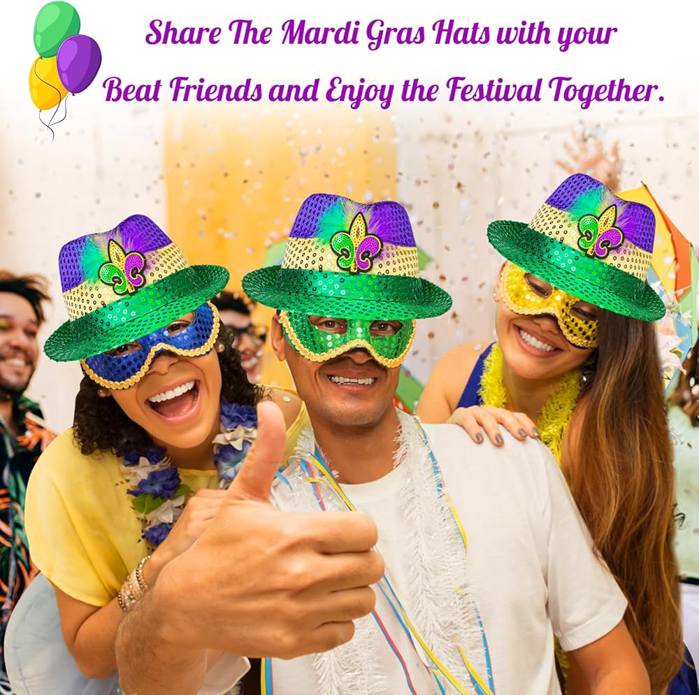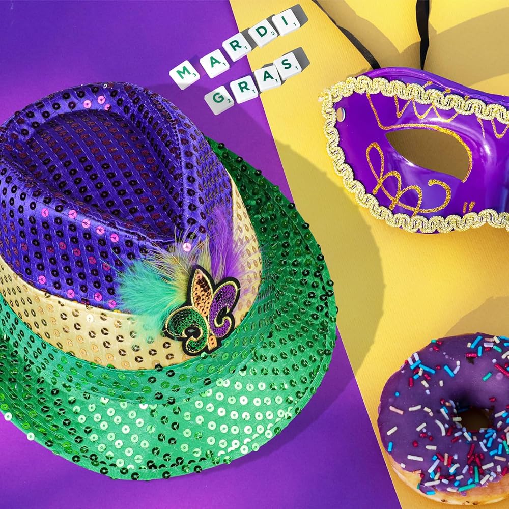 This Sparkling Sequins Fedora Hat is a fantastic choice whether you're hitting the Mardi Gras parties, joining the street parades, or simply soaking up the festive atmosphere. It makes you look uniquely eye-catching and adds a touch of lightweight comfort to your Mardi Gras ensemble. 🎭✨👒