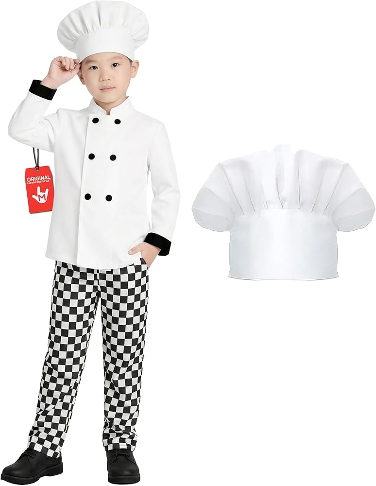 Chef Dress up for kids includes classic white kids chef hat, white chef's top, and pants.