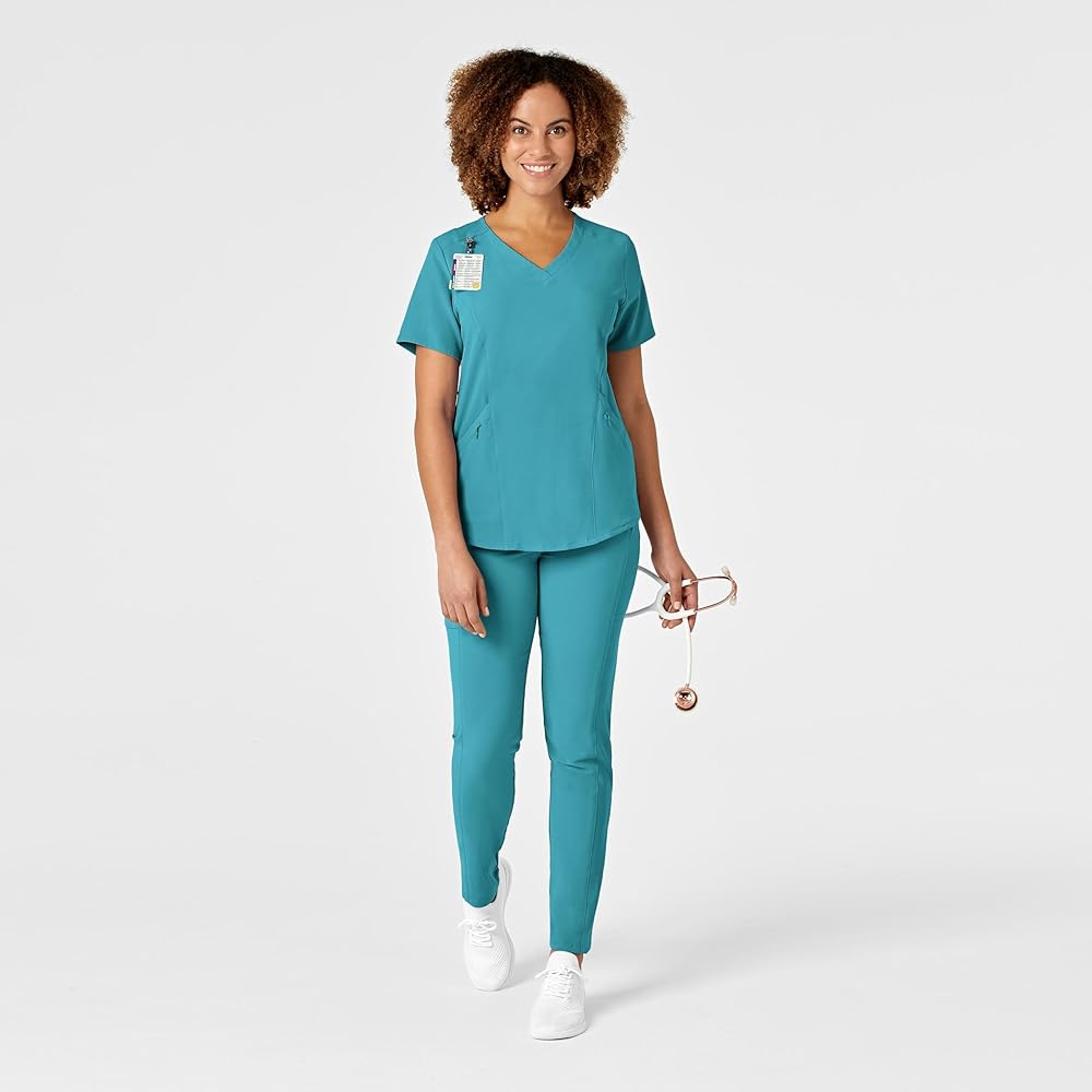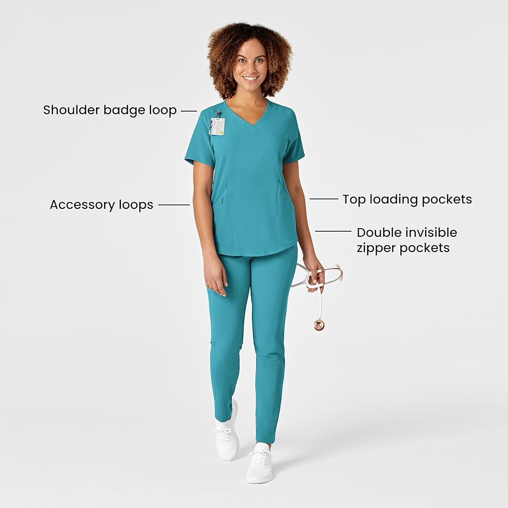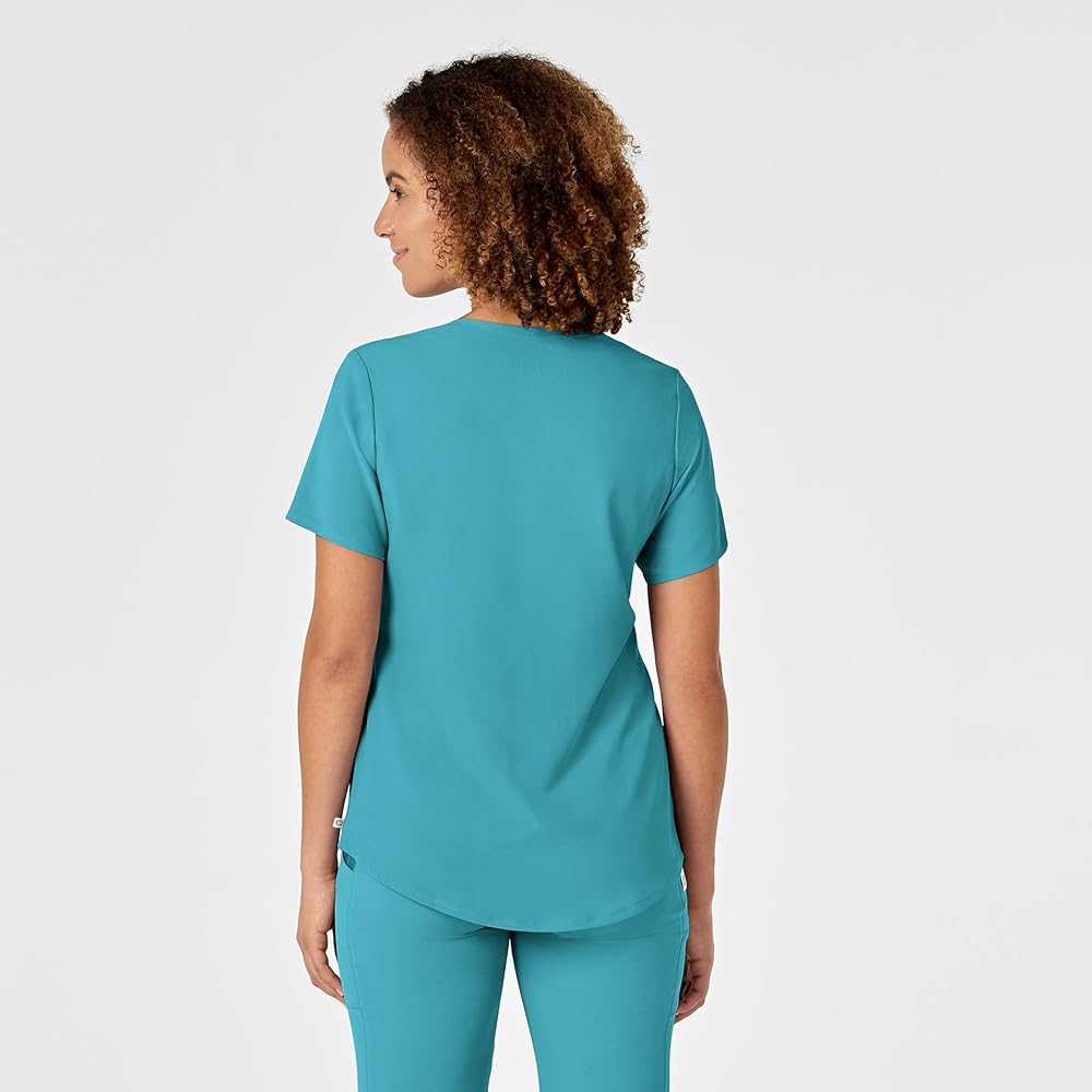 WonderWink RENEW is the latest innovation in sustainable scrubs. With the goal in mind to be a bit more kind to our planet the packaging is an earth-friendly biodegradable material, the hangtags are made from FSC certified paper, and the fabric is a recycled polyester fabric blend you're going to love the feel of! With extra details you've come to expect from WonderWink you're sure to find a fashionable favorite in this scrubs collection. The Womens V-Neck Top boasts a flattering curved v-neckline, two top-loading patch pockets with a layered invisible zip pocket on each. The grosgrain accessory loops inside the wearers right top-loading pocket will help you keep your gear organized in your pocket. The sleek shoulder badge loop keeps your badge in prominent sight while still being out of the way. The shape-enhancing princess seams and curved bottom hem combine for a stylish scrub top that accentuates all the right curves so you can look and feel confident in your uniform.