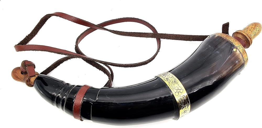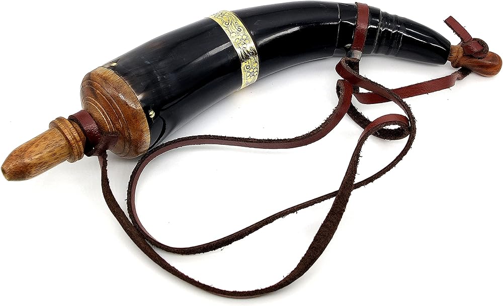 100% GENUINE HORN Our gunpowder horns are individually made by hand. Each one is unique and the result of patient craftsmanship by skilled horn makers using only 100% ETHICALY SOURCED REAL HORN, carefully chosen for their beauty, strength, and sturdiness. As with any natural product, the color and shape will have natural variations. No two are the same. The wooden end cap is carefully cut to fit the open end of the horn and after drilling through the pointed end is provided with a tightly fitting plug which is pulled out for loading powder into a muzzle loading shotgun, musket or flintlock rifle. The wood on our powder horn is black walnut or mahogany neither of which absorb water in the rain and therefore keeps the powder dry. The leather strap is cut from one of the split steer hides we have been cutting pieces off of for years. A powder horn was a container for Gunpowder ♦ Made of 100% Solid Horn ♦ Size: 11 Inch ♦ Regardless of Material or Shape ♦ For which powder flask is the strictly correct term