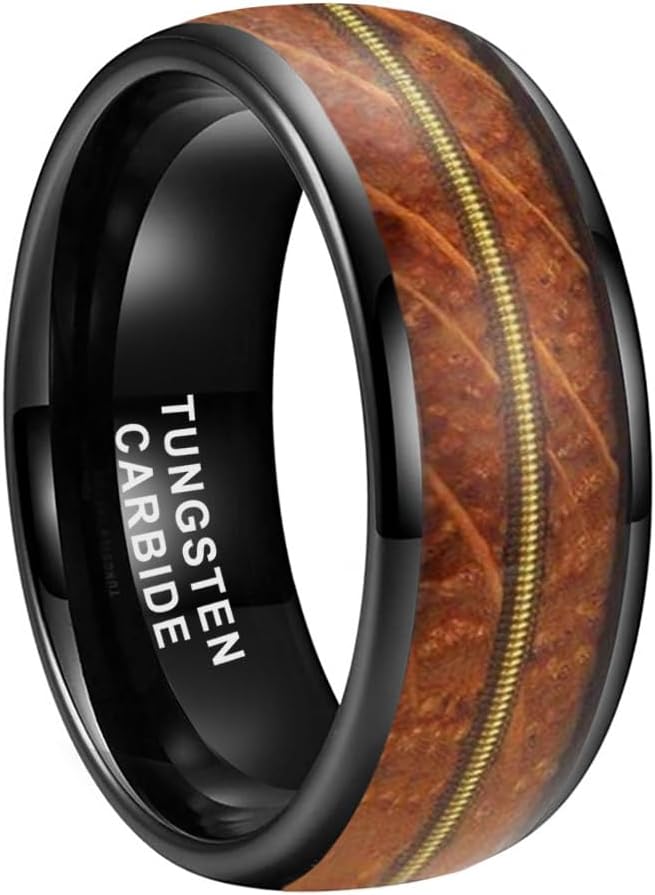 8mm Silver / Black / Gunmetal and Gold Tungsten Carbide Rings for Men Women Engagement Wedding Bands Whisky Wood Guitar String Inlay Domed Polished Shiny Comfort Fit.