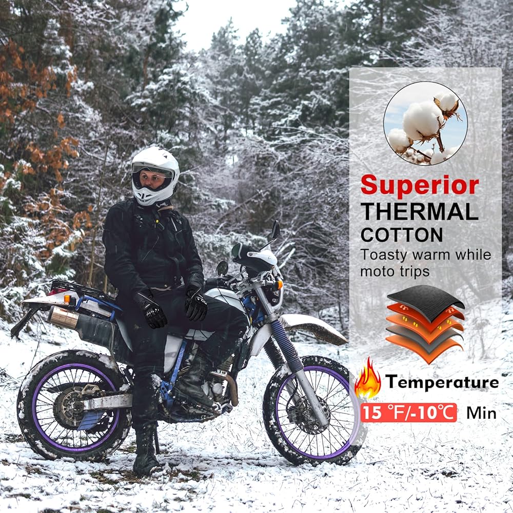 🧤 No More Cold. CHANGEMOORE cold weather motorcycle gloves stop the wind from freezing your fingers. With toasty superior thermal cotton and soft liner, you could not feel any coldness seeping in from the wind. Minimum temperature down to 15℉, perfect for those who are commuting often in the cold or want to tour in the winter. Warm Tips: These warm motorcycle gloves for men obviously perform better if you have cold weather pants, jacket and boots.