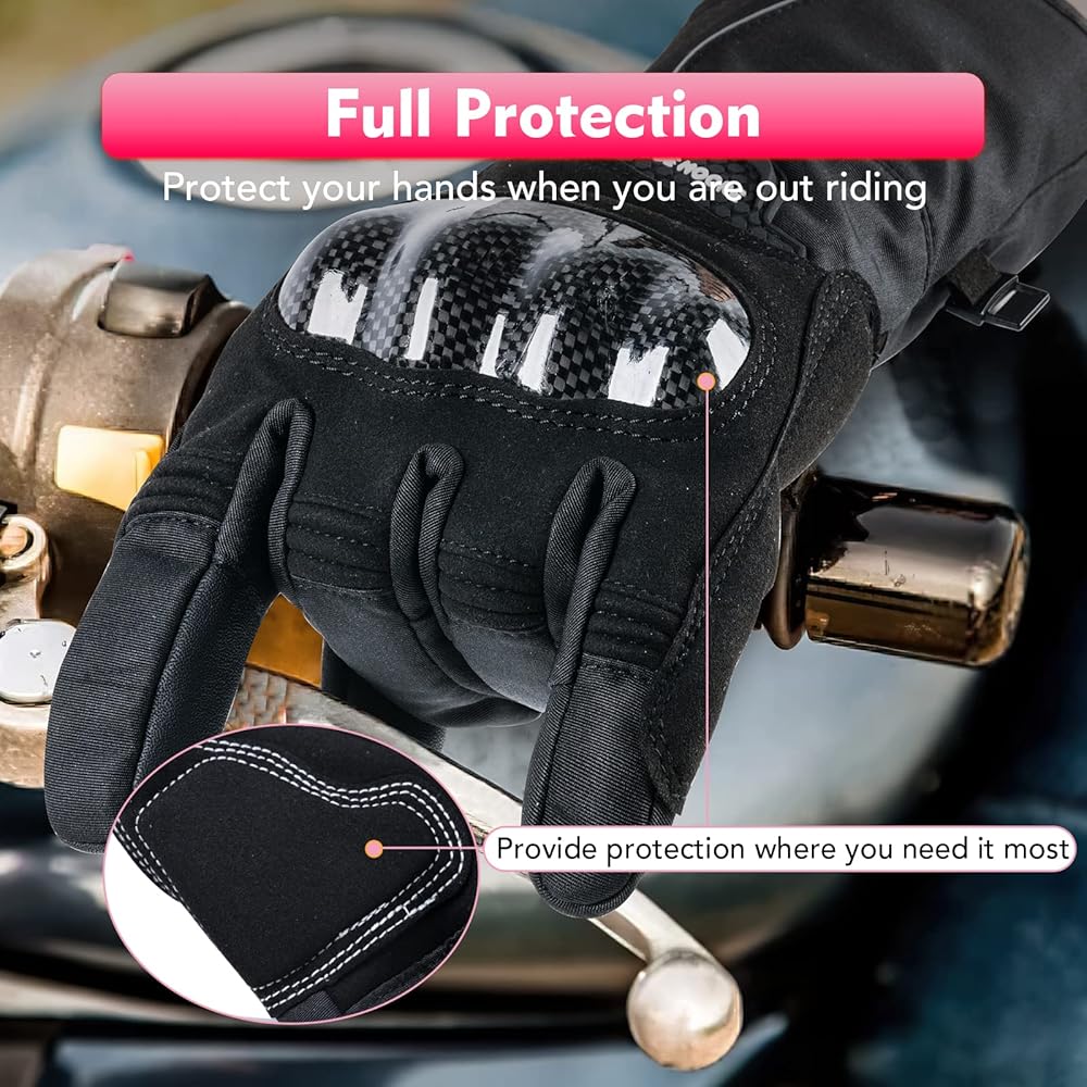 🧤 Knuckle & Hands Protection. CHANGE MOORE winter riding motorcycle gloves offer a substantial amount of protection in all the right spot for your hands. Carbon fiber on the knuckle is aligned great with zero discomfort and reduce hurt in case of a fall. Soft padding on the palm offers abrasion and impact protection in case you go down.