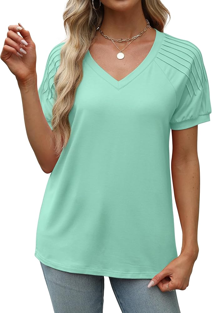 ✦Design: Short sleeve shirts with pleated shoulder, v neck t shirts loose fit, soft basic tees for summer, solid color, dressy casual tops. Show off your individual style with the distinctive pleated sleeve design.