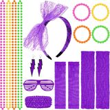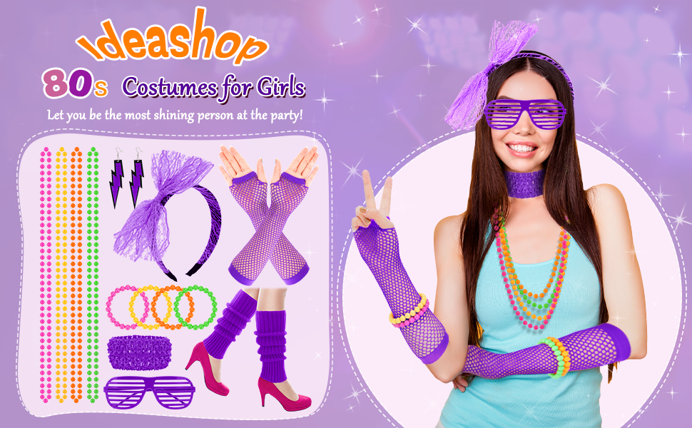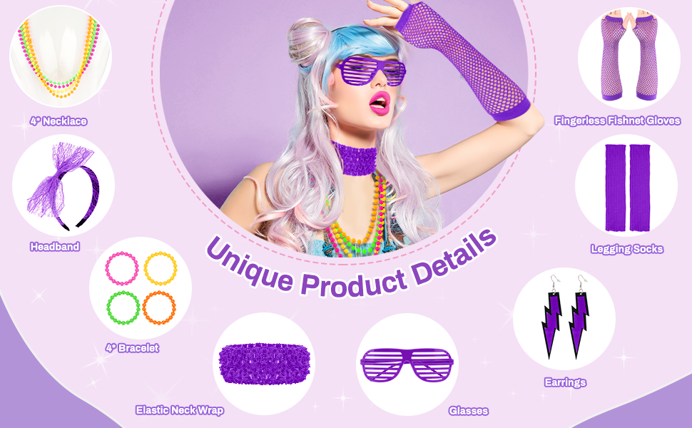 【High Quality Material】Our 80s costumes for women is of high quality, using materials such as fabric, lace and plastic. The leg socks are soft and skin-friendly, the neck wraps and gloves are elastic enough to fit most people, the headbands, glasses and earrings are durable, and the bracelets and necklaces have smooth surfaces and colorful colors.