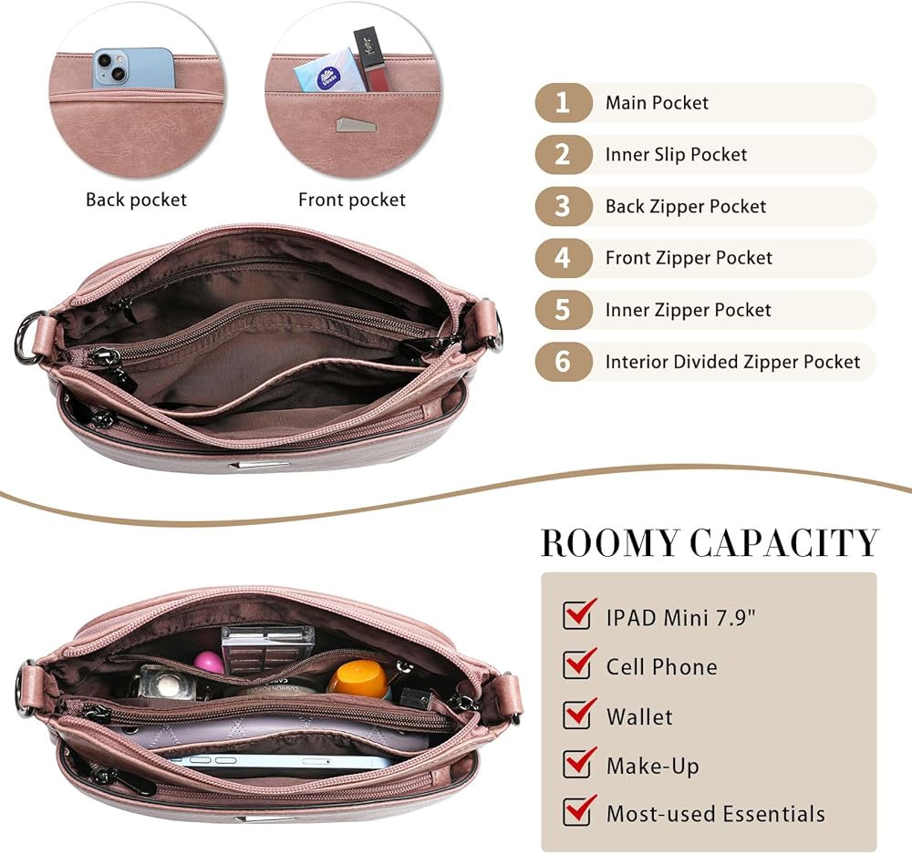 【large capacity】The small shoulder handbag for women's shoulder bag is equipped with a zipper closure, and the women's shoulder handbag interior features a main compartment, slot pockets, and zippered pockets. The crossbody bag comfortably holds your cell phones, sunglasses, keys, cosmetics, cash, coins, napkins, and cards.Keep your hands free.
