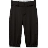 YOUTH KNICKER BASEBALL PANT 100% DOUBLE KNIT 12 OZ. POLYESTER TRADITIONAL KNICKER LENGTH PANT WITH COVERED ELASTIC BOTTOMS ENDING JUST BELOW KNEES DOUBLE KNEE CONSTRUCTION FIVE PRO-STYLE BELT LOOPS ZIPPER FLY, TWO SNAP CLOSURE TWO DOUBLE WELTED SET-IN BACK POCKETS 2 1/2" ELASTIC WAISTBAND YOUTH INSEAMS: XS(11"), S(11 3/4"), M(12 1/2"), L(13 1/4"), XL(14") AVAILABLE IN SIZES: XS-XL BLACK