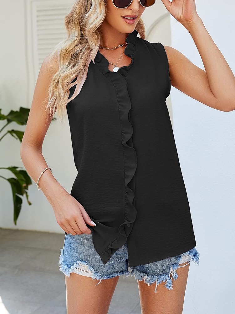 [Features]: Trimmed with ruffle placket button front blouse, Ruffled collared, V neck, Sleeveless, Solid Color, pleated shoulder and back, Button down Shirts. It's the fashion blouse.