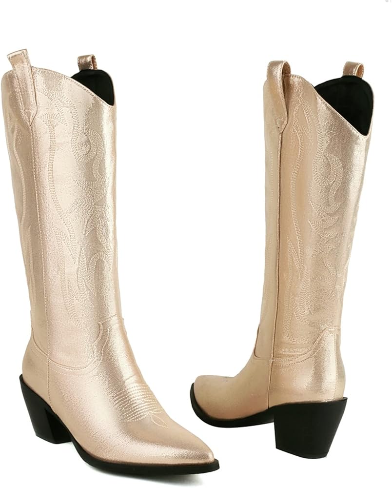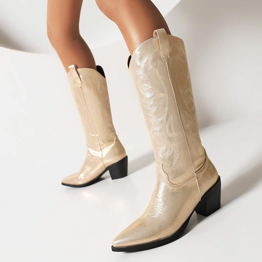 Kirliner Embroidered Cowboy Western Boots Glitter Metallic Leather Cowgirl Boots Mid Calf Pointed Toe Chunky Heel Boots