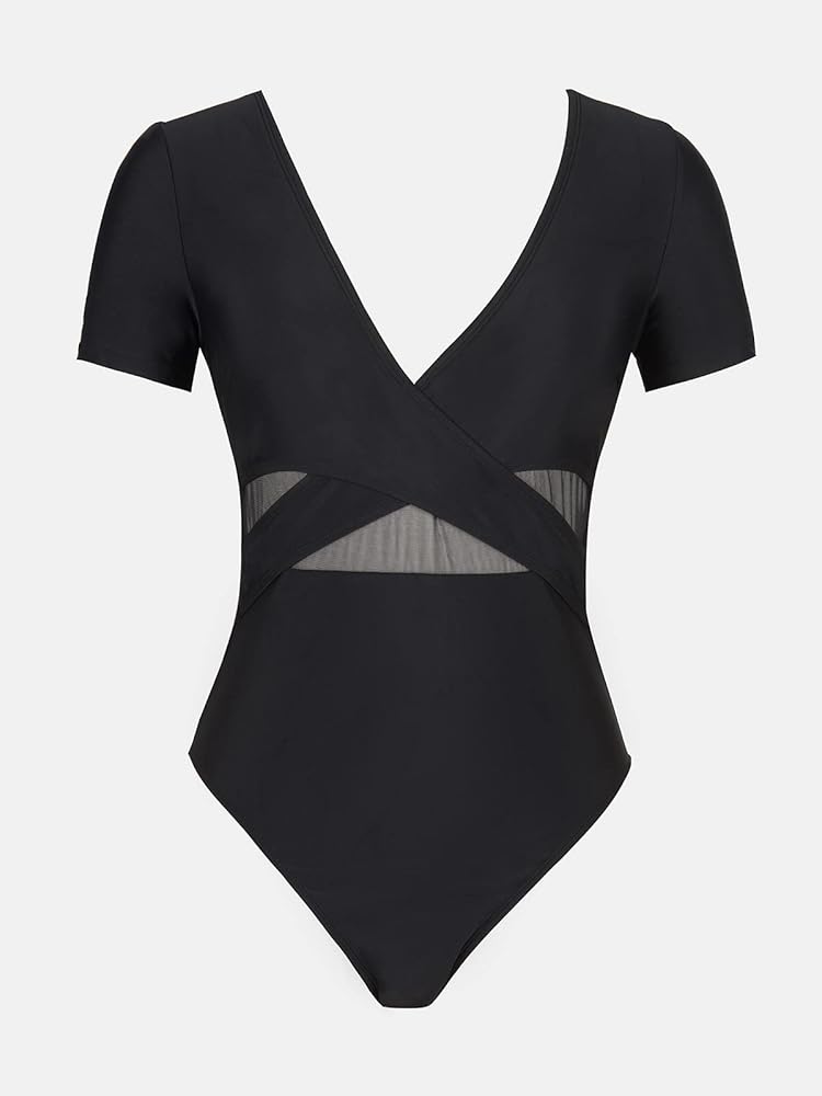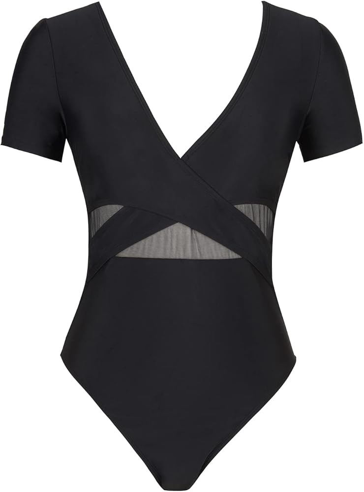 Design:Sexy yet functional, this one piece swimsuit is everything you need for your upcoming adventure. With its alluring mesh inserts, wrap design, surplice neckline, short sleeves for comfort, and cheeky cut, you will be ready to hit the beach!