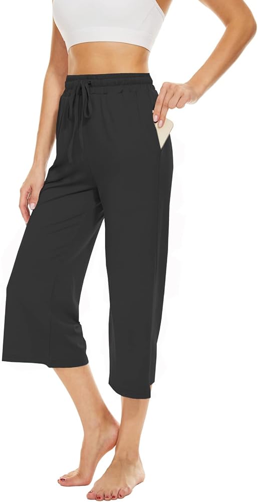 Drawstring Capris with Pockets- Loose yoga capris with elastic waistband is comfortable and easy to pull up and down. The pockets are nice and big to carry your phone, wallet, key, etc. Wide leg capri sweats have a flattering shape and drape nicely from the hips to the leg. Womens capris for summer, loose capri workout pants, lounge pants capris.
