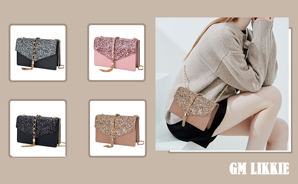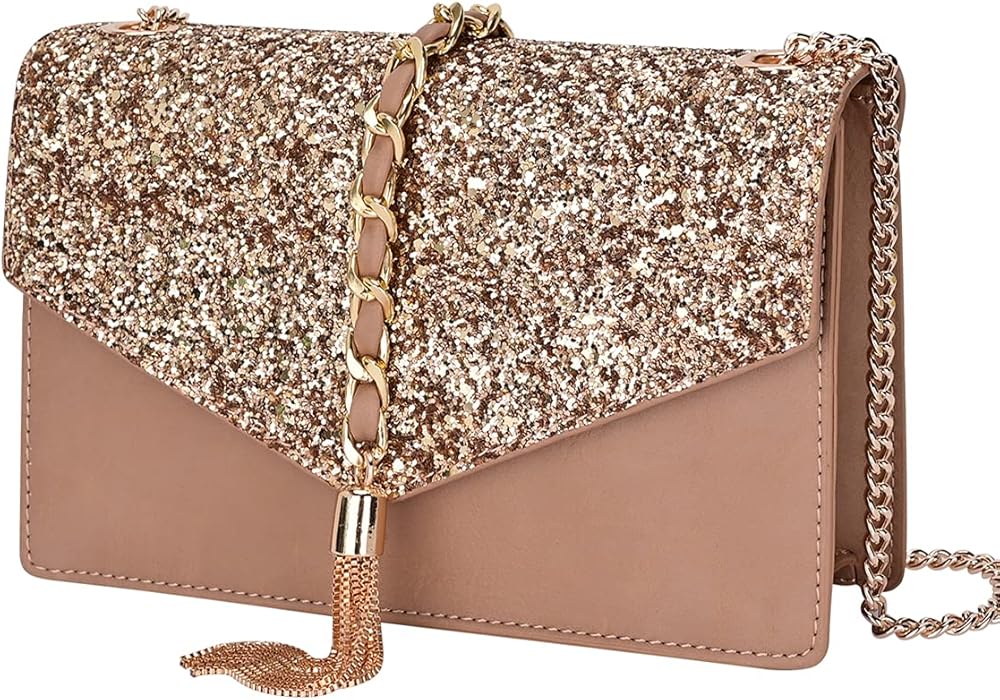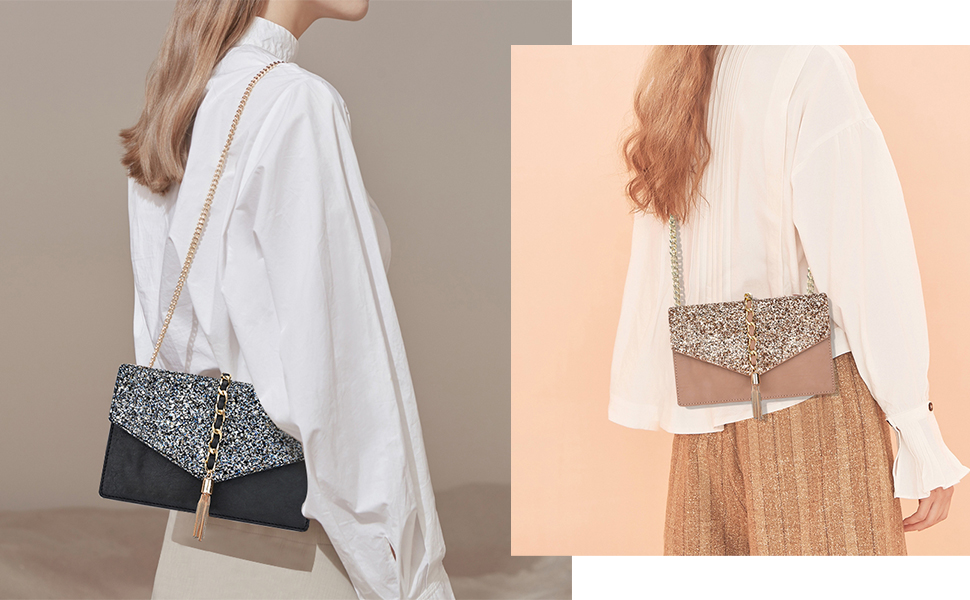 PREMIUM QUALITY & FASHION DESIGN - This glitter fringed envelope purse is made with high-quality textile & PU Leather, polyester lining, and sturdy gold-tone hardware. A dash of sparkle is the perfect way to up your glam factor. The Glitter textile can reflect the light, making the bag sparkle and making you bec ome the star of theparty. It is suitable for all types of outfits to match