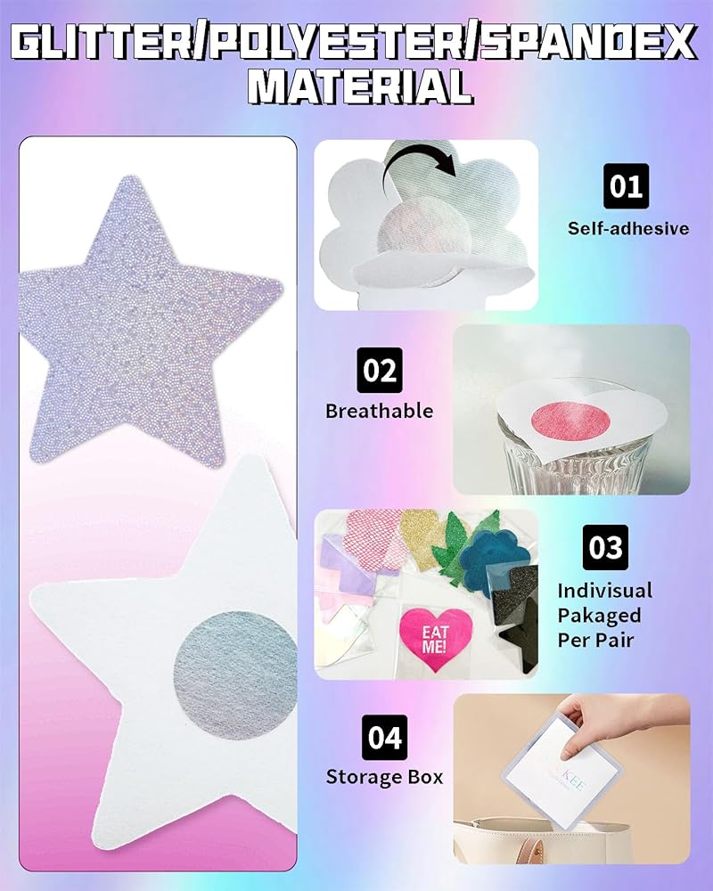 【Stunning Variety】Get 15 pairs of disposable nipple covers in silver, pink, and purple shades. They come in various shapes like stars, flowers, crosses, hearts, and are made with different materials including satin, lace, and glitter, all individually packaged.
