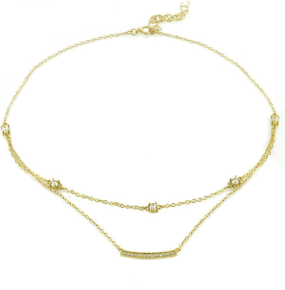 • FEATURE - This attractive necklace features a thin choker chain and necklace; showcasing a fashionable layered style. There are 3mm cubic zircnoia stones stationed on the choker, and a cubic zirconia studded bar dangling off the necklace.