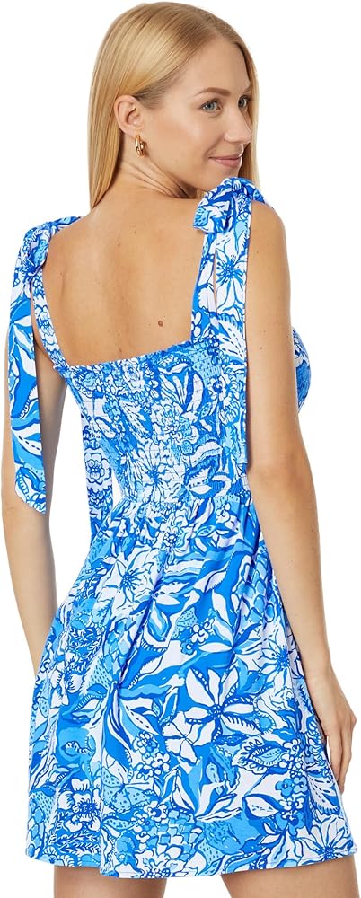 Lilly Pulitzer Rivera Romper is a great pick to keep your style statement a notch higher and be at comfortable all day long! Pull-on style. Smocked upper. Flounced hemline with pleats. Wide knotted straps on shoulder. Printed allover. 94% rayon, 6% spandex. Machine wash, dry flat. Imported.
