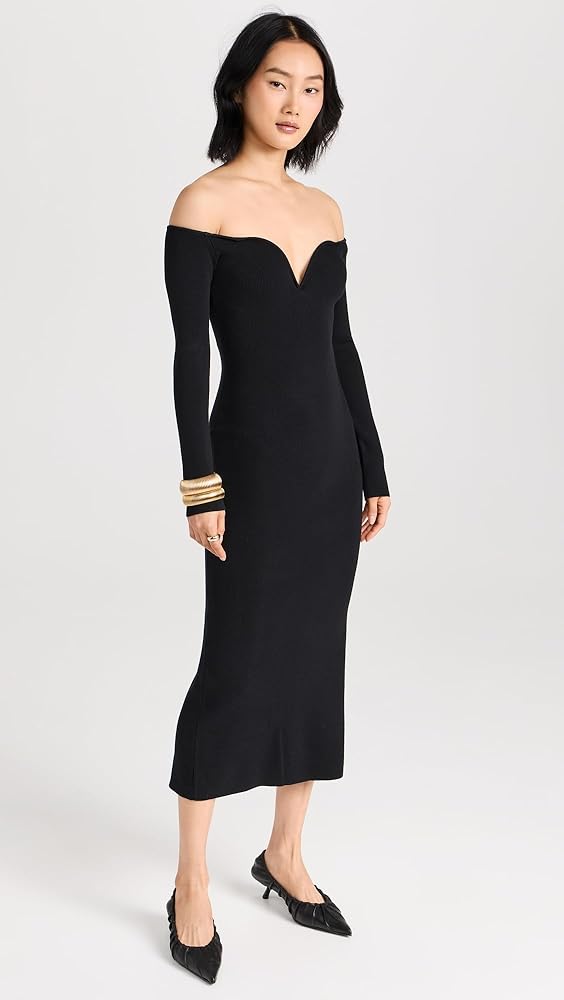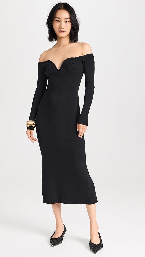 Runs true to size. , Designed with a formfitting silhouette and midi length. Off-shoulder neckline may limit arm movement. Ribbed knit offers some stretch. Fashion tape is recommended to secure the sweetheart neckline.