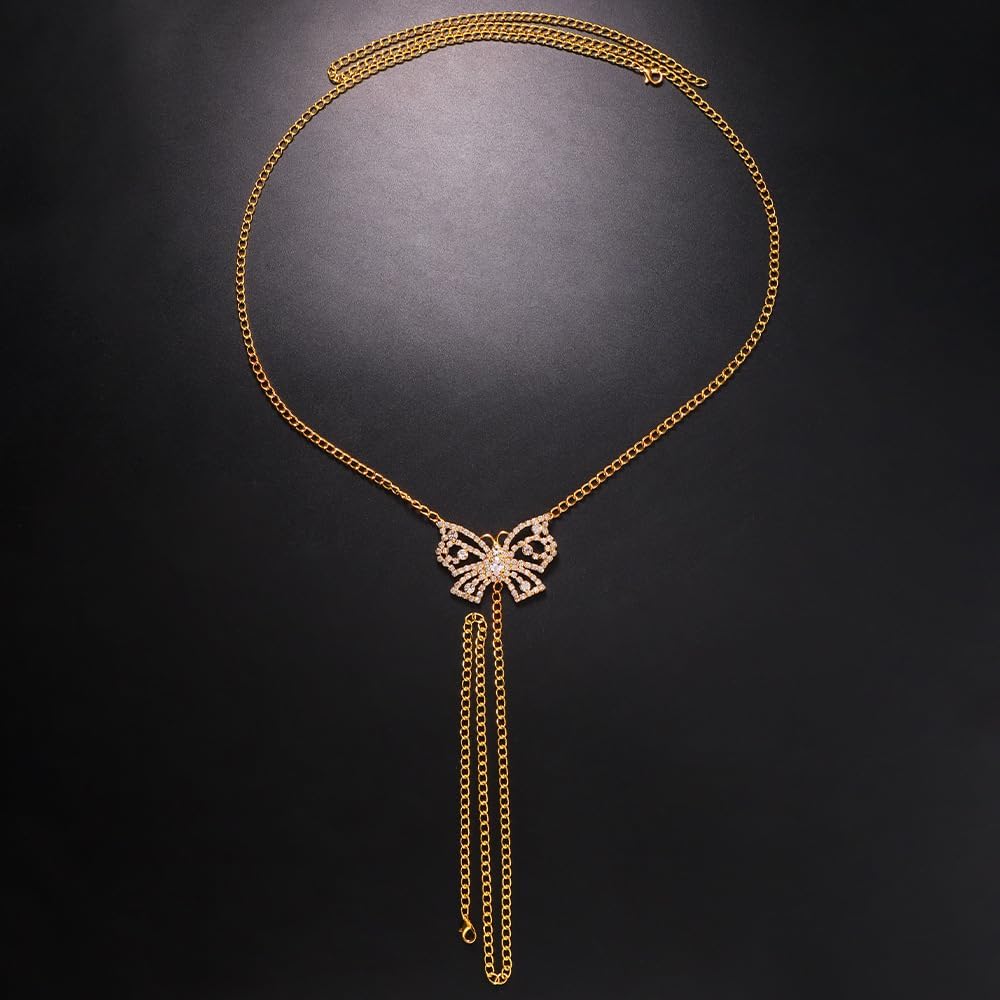 Rhinestone body chain is made of alloy and rhinestones.