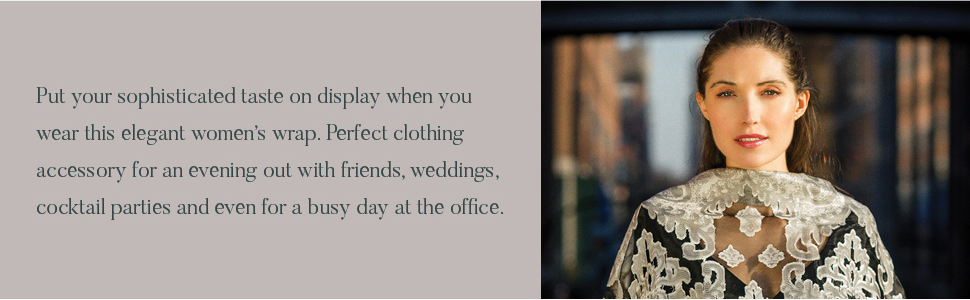 PREMIUM QUALITY. This jessica mcclintock shawl is made with 73% viscose and 27% nylon. It is breathable with a silk like feel. A comfortable wrap that will keep you warm while looking trendy at the same time. Perfect to wear in the most special occasion and gathering.