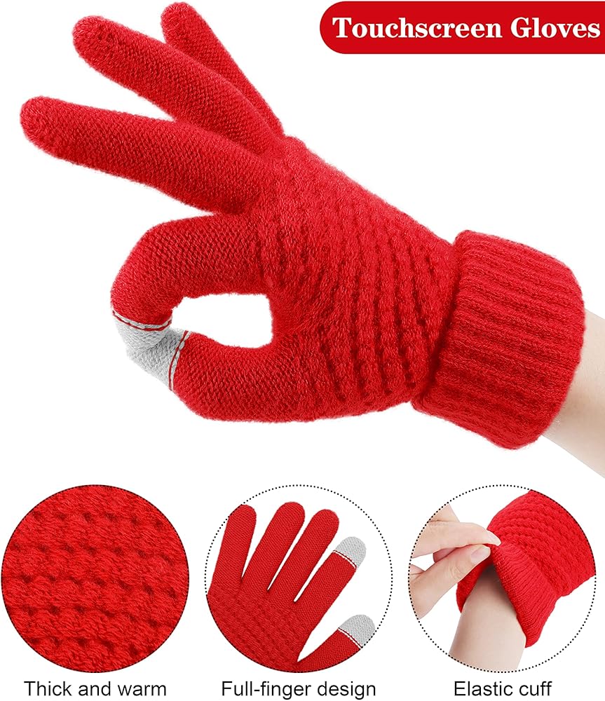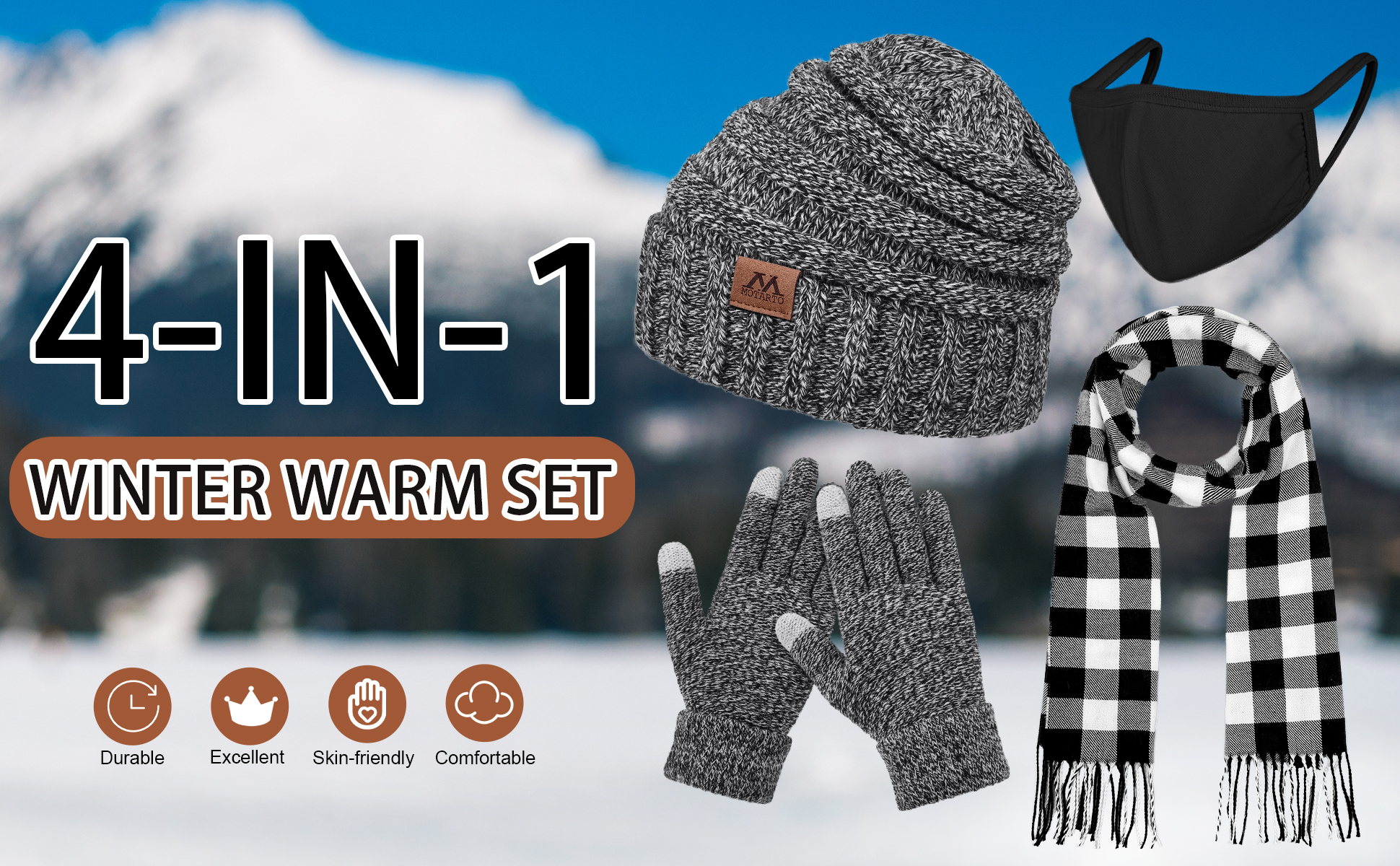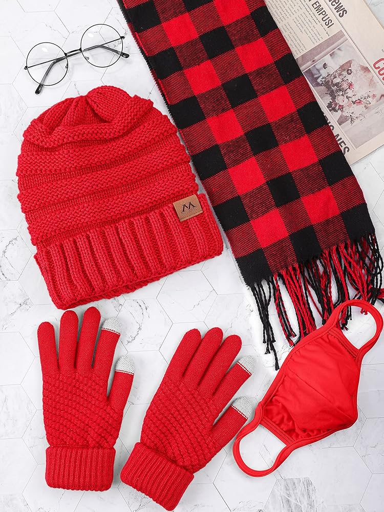 Package contents: this winter warm set consists of 1 knitted beanier, 1 buffalo plaid knitted scarf, 1 warm cover, and 1 pair of touchscreen gloves, enough to keep you warm in cold winter