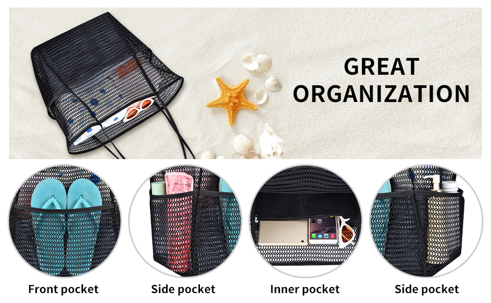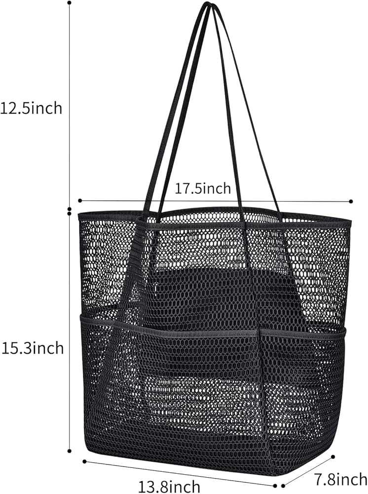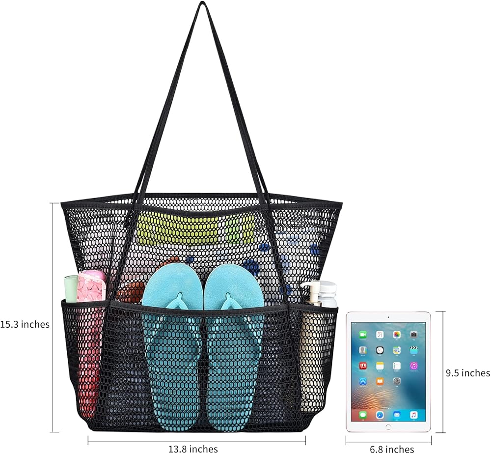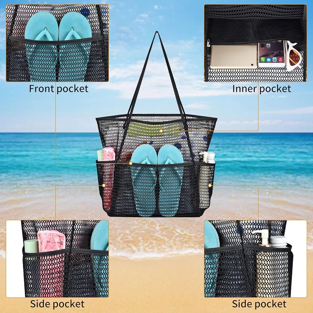Mesh Beach Bag with Multiple Pockets for Women, Beach Tote Bag Ideal for Your Family Beach Trip, Lightweight Beach Accessories for Swimming Vacation Picnic - Black