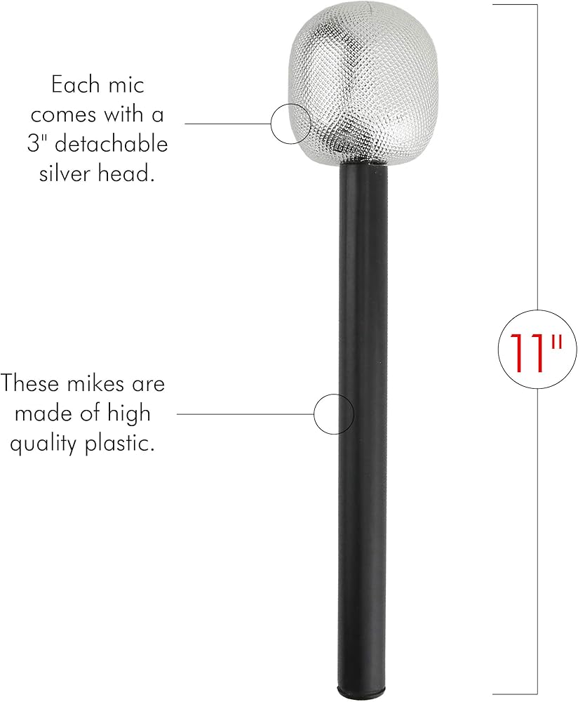 - Each mike is made of plastic and is 11" long; an 8" black stick and a 3" detachable silver head.