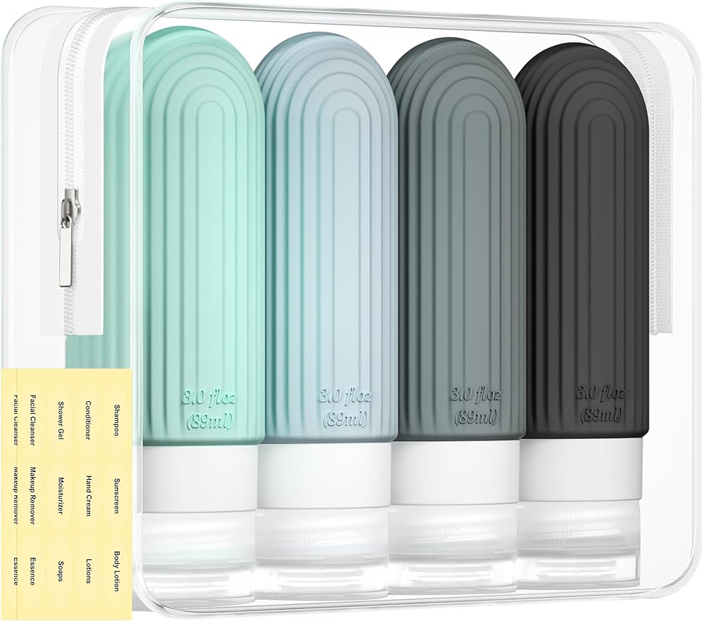 TSA Airline Carry on Approved - These 4 set 3oz. silicone bottles are TSA certified standard travel containers, and the clear toiletry bag allows you to see the contents at a glance, allowing for unobstructed boarding. This travel kit is handy and portable, maximizing luggage space.