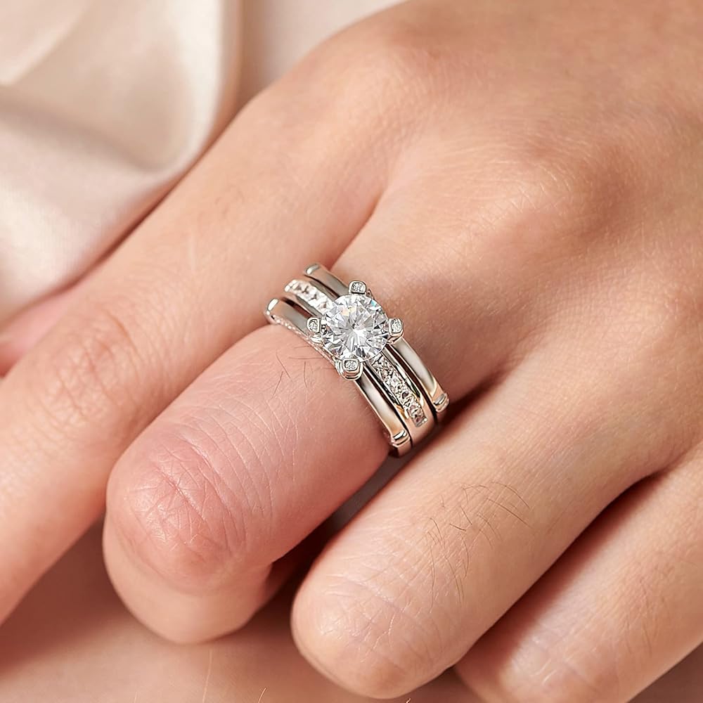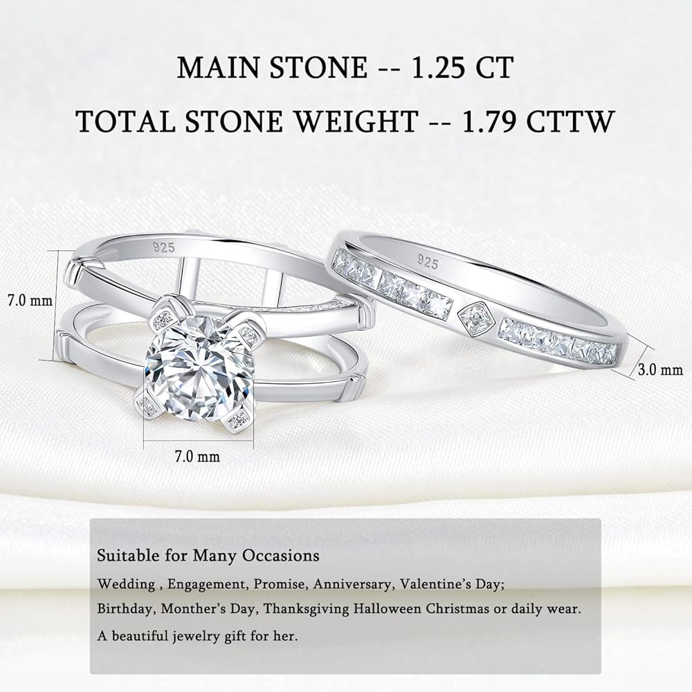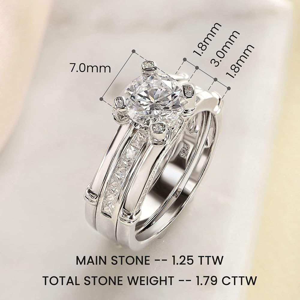 ❤ Trendy Style - Primary Stone: 1pc/1.25ct; Side Stone: 41pcs/0.53ct. This interchangeable wedding ring set features a round cz stone and rows of smaller cz stones set in engagement ring. Additional cubic zirconia stones are set into the 925 sterling silver matching wedding bands.