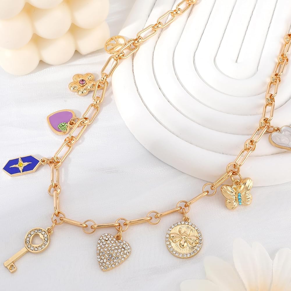 The chain elegantly features various adorable pendants, including a key, zircon heart, blue cross star, purple heart , white heart, flower, butterfly, peace sign, and a yellow bee pendant.