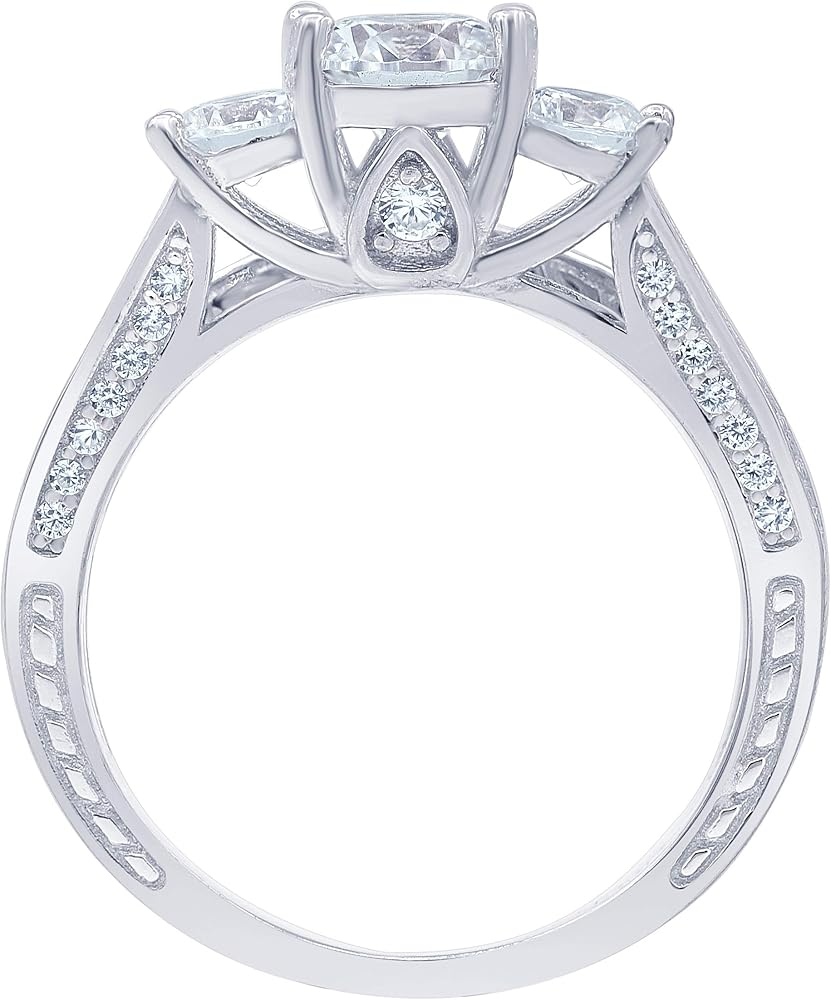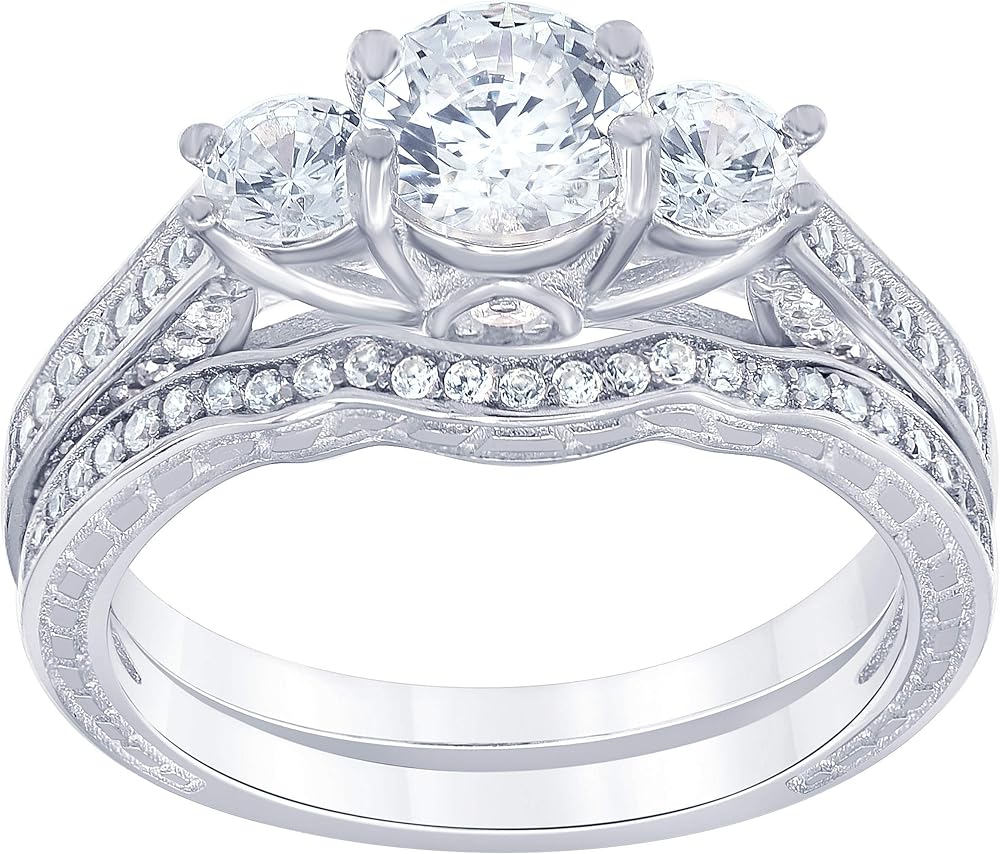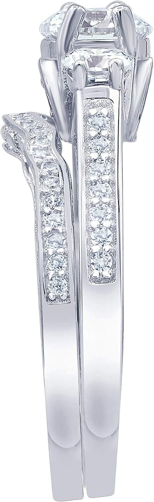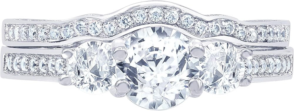 THREE STONE PLUS BRIDAL RING SET: She has waited her whole life for this moment; make it amazing with this spectacular Swarovski and CZ engagement ring. Crafted in Sterling Silver, this three-stone style features a stunning Swarovski at its centre, flanked by AAA cubic zirconia. Smaller CZ line the ring's cathedral shank along the top and sides, creating an impressive look. The coordinating wave band glistens with CZ to complete her ensemble. This bridal set is a gift of truest love.