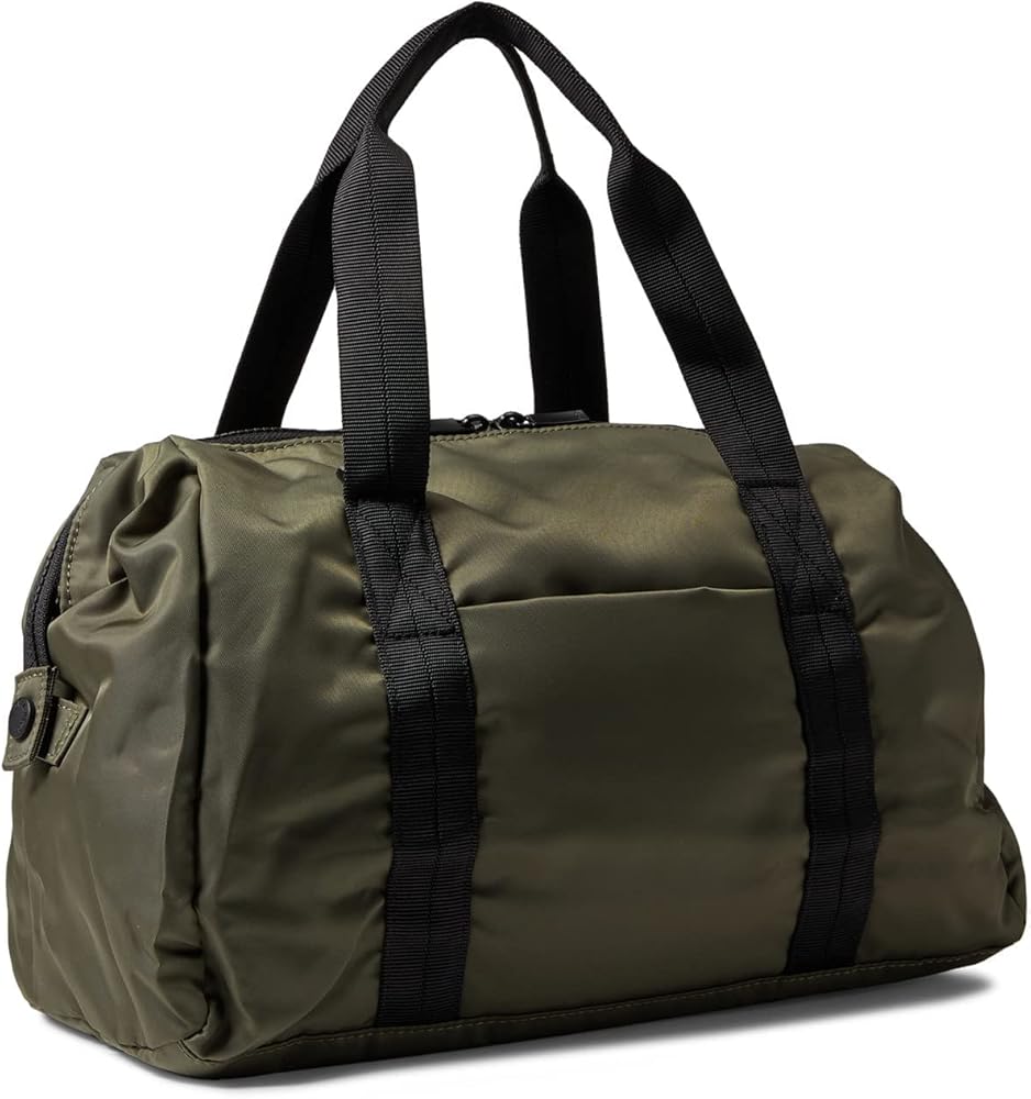 - Double handle with 8" drop |Front and back exterior pockets |Interior zip pocket|2 interior slip pockets |Adjustable and removable 48" long shoulder strap|Key hook|Black hardware |2 year warranty| Dimensions: H: 9.0 inches D: 7.0 inches W: 14.5 inches| Weight: 0.90 lbs | Volume: 14.9 l| Outer Body Material: 100% recycled PET polyester | Lining Material: Polyester