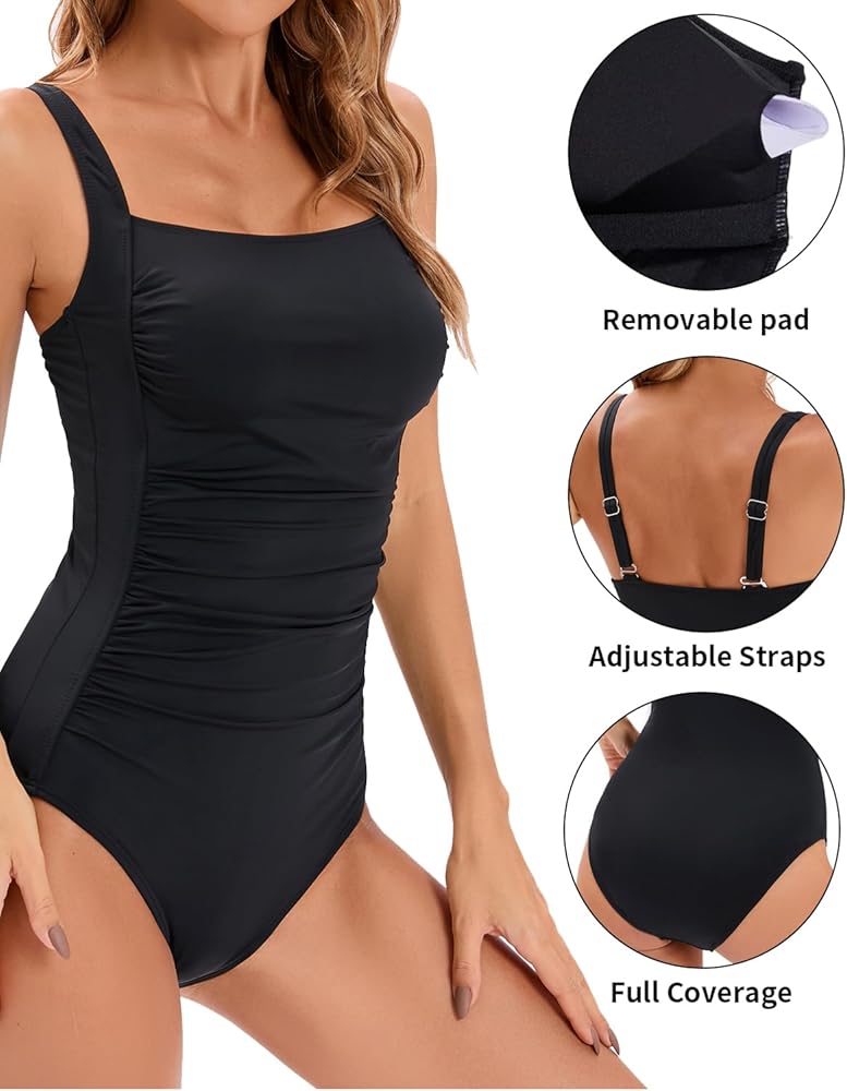 Tummy Control Swimsuits for Women: Ruched design provides full coverage effect on the stomach and hides your tummy imperfections perfectly. This feature helps to avoid exposure on the beach, making you look slimmer and increasing your confidence.