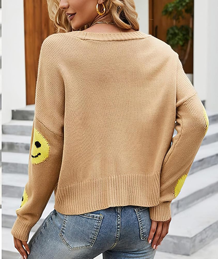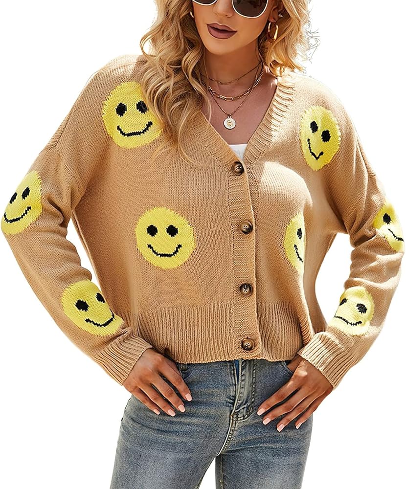 Features: Stylish boho style, sexy v-neck, button closure, single breasted, long sleeve, ribbed cuffs and hems, beautiful daisy flowers pattern, lovely smile face printed, jacquard knit, regular length.