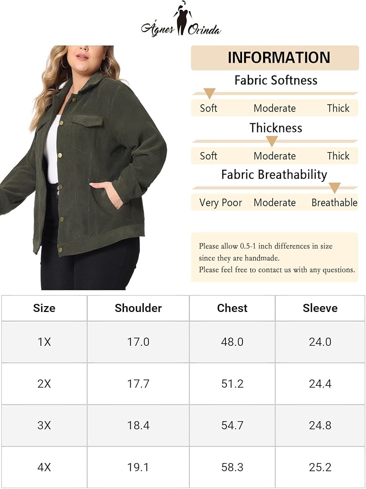 Made from corduroy material, soft, skin friendly, lightweight, warm, durable and cozy to wear. This lightweight shacket jacket is perfect for layering over any outfit and is available in plus sizes to flatter all body types