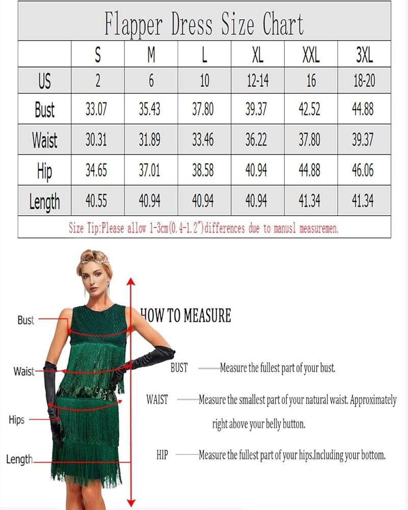• Go Back in Time to the Roaring Twenties with this Fabulous Flapper Costume Set. 1920s flapper dress size: S = US 4-6 , M = US 8-10 , L = US 12-14 , XL = US 14-16, XXL=US 16-18, 3XL= US 18