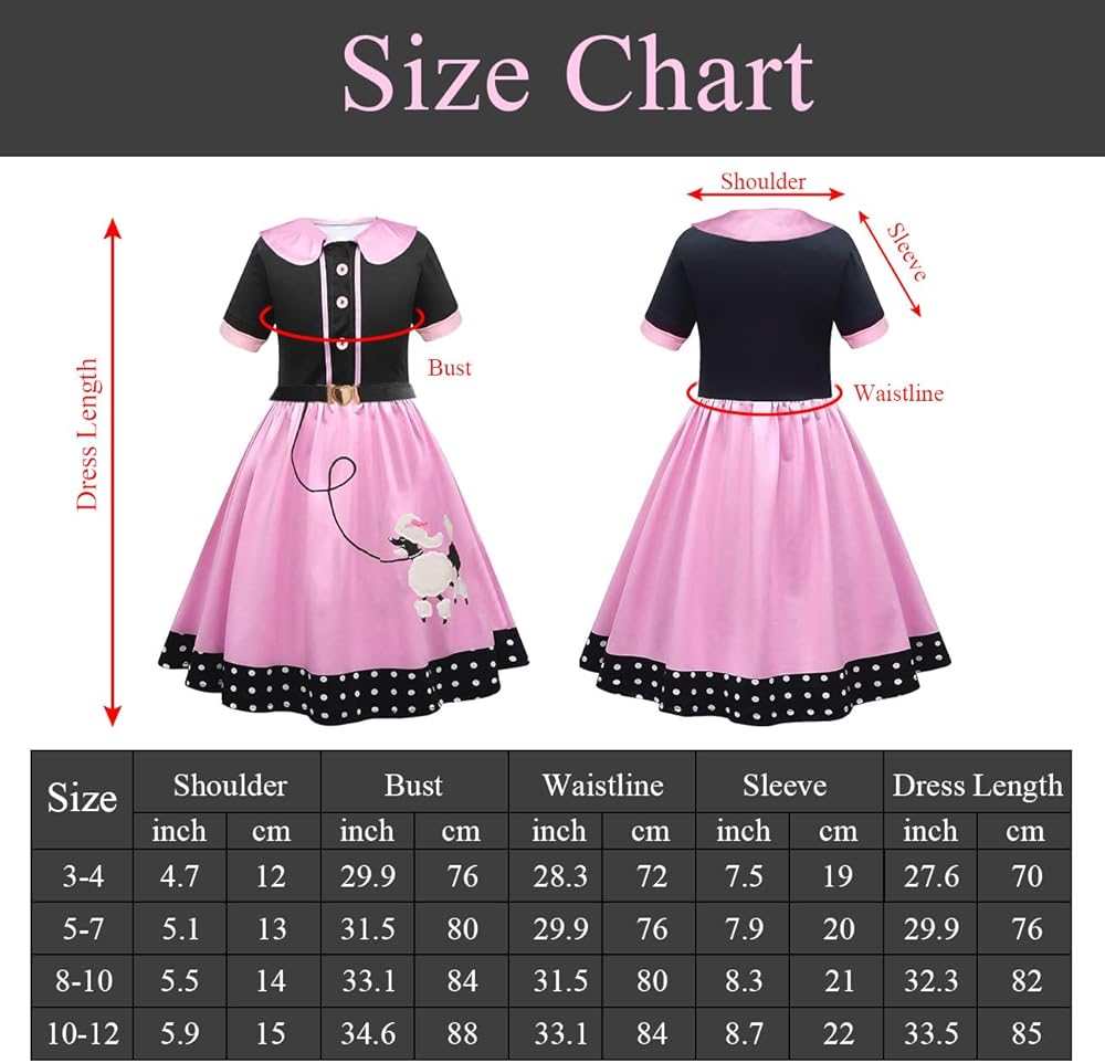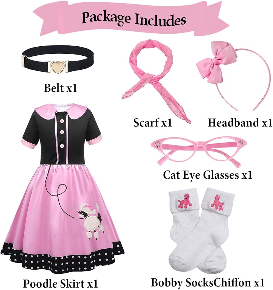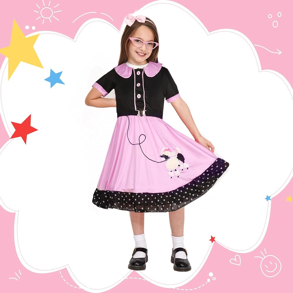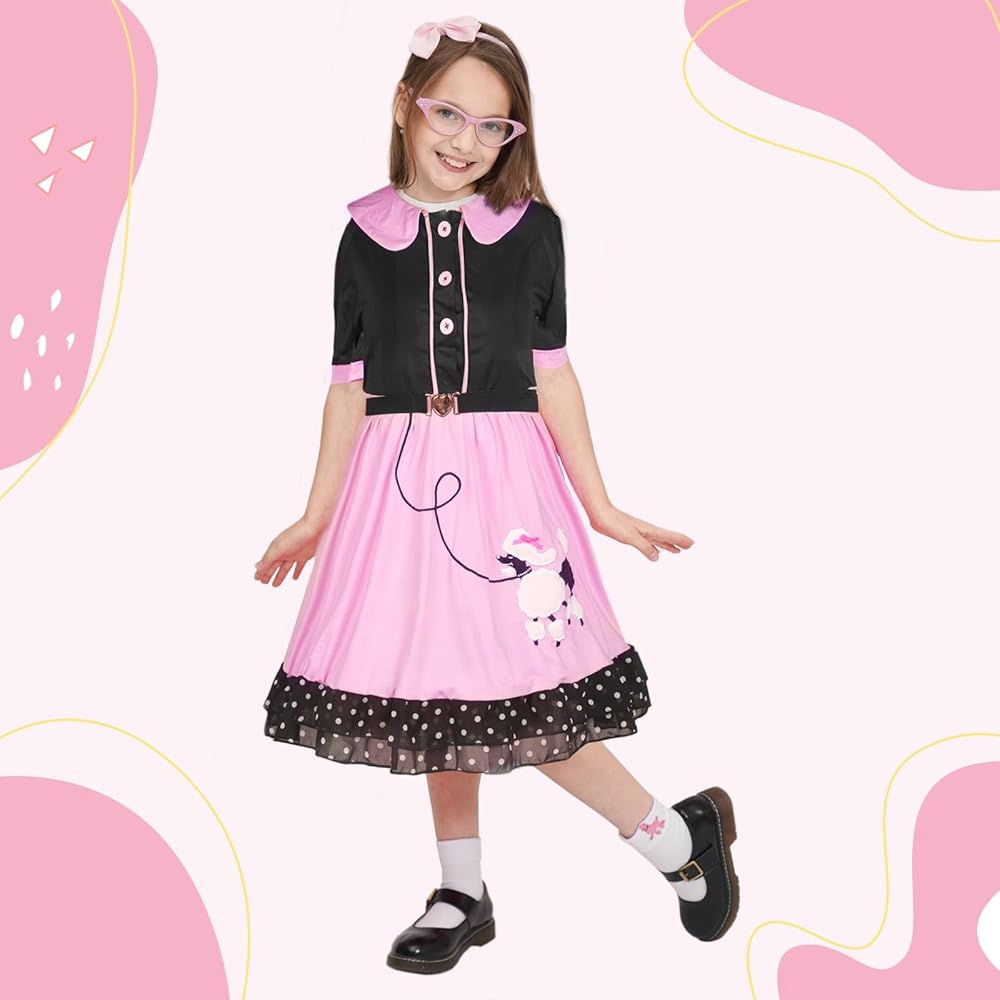 OCCASIONS: This poodle skirt Costume is Excellent for Halloween Funy Costume, Halloween Trick or Treating, Dress Up Party, and Themed Birthday Parties,50 Days of School Costume in Kindergarten, 50th Day Celebration, Sock Hop Costume, Kids Grease Costume Costume, Decades Costumes for Girls.