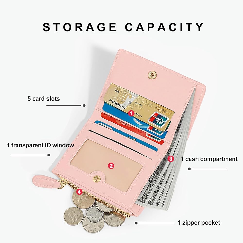 Storage Capacity: The card holder wallet for women has 5 card slots, 1 transparent ID window, 1 cash compartment, 1 zipper pocket, enough to meet your daily essentials, such as credit cards, bank cards, ID card, cash, coins, changes, photos, and so on. Small but roomy, it's small for a greater purpose