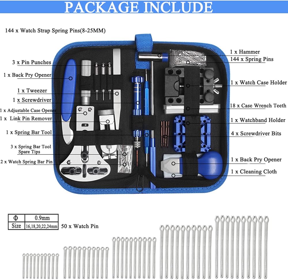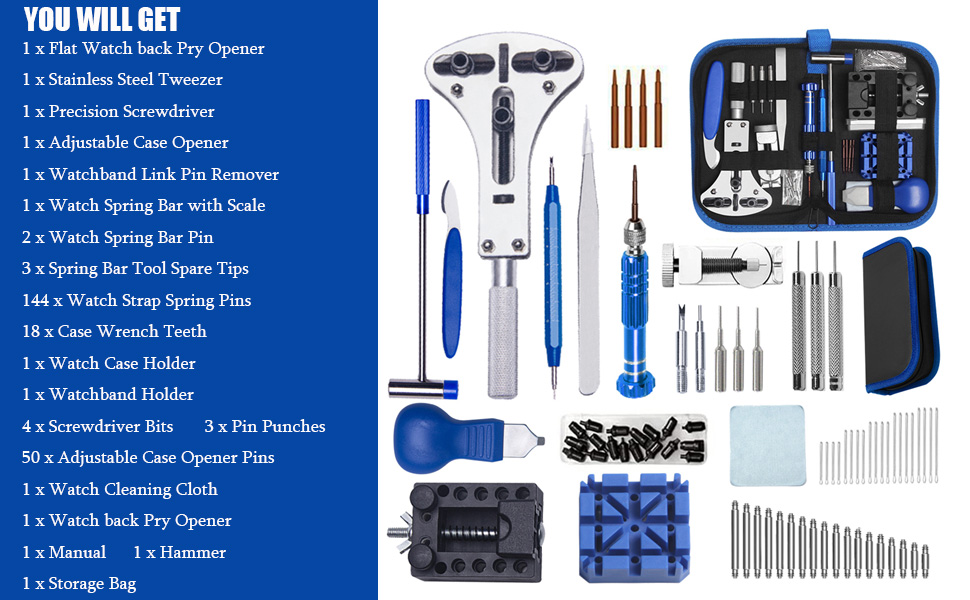 【YOU WILL GET】The complete 235pcs watch tool kits suit for both professional and general use. Pin Punches, Flat Watch back Pry Opener, Stainless Steel Tweezer,Precision Screwdriver,Adjustable Case Opener,Watchband Link Pin Remover,Watch Spring Bar with Scale, Watch Spring Bar Pin,Spring Bar Tool Spare Tips,Hammer, Watch Strap Spring Pins,Case Wrench Teeth, Watch Case Holder,Watchband Holder, Screwdriver Bits,Adjustable Case Opener Pins,Watch Cleaning Cloth, Watch back Pry Opener,Manual,Bag