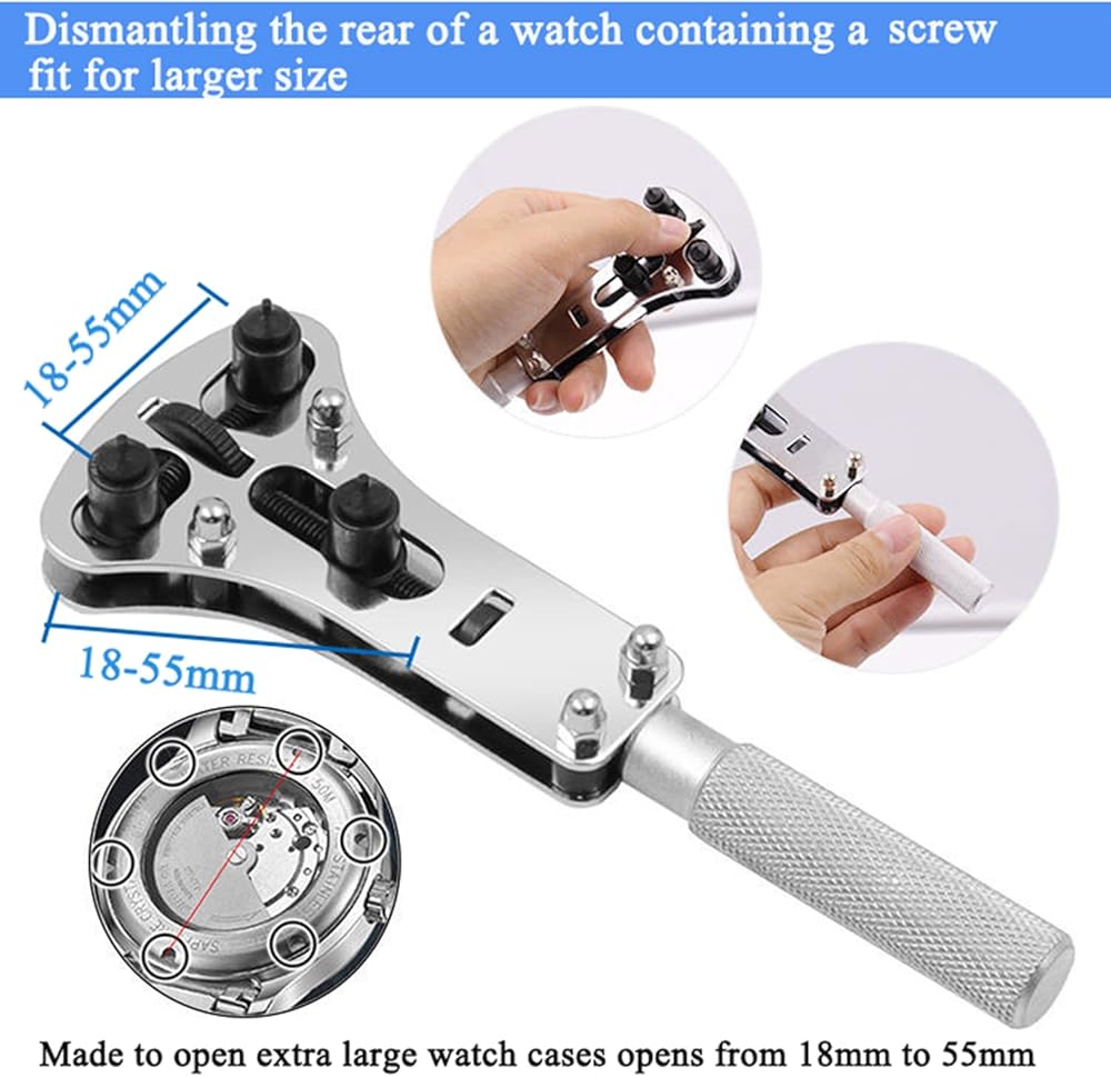 【WIDELY APPLICATION】Watch tool kit perfect for common watch trouble, such as watch battery replacement, adiust the strap length, open the back cover, replace the strap, remove the watch strap, fix the watch band, changing watch batteries, gaskets and so on. From disassemble to assemble, open to close, all the tools needed are taken into account.If you want to repair your watch just use this kit.