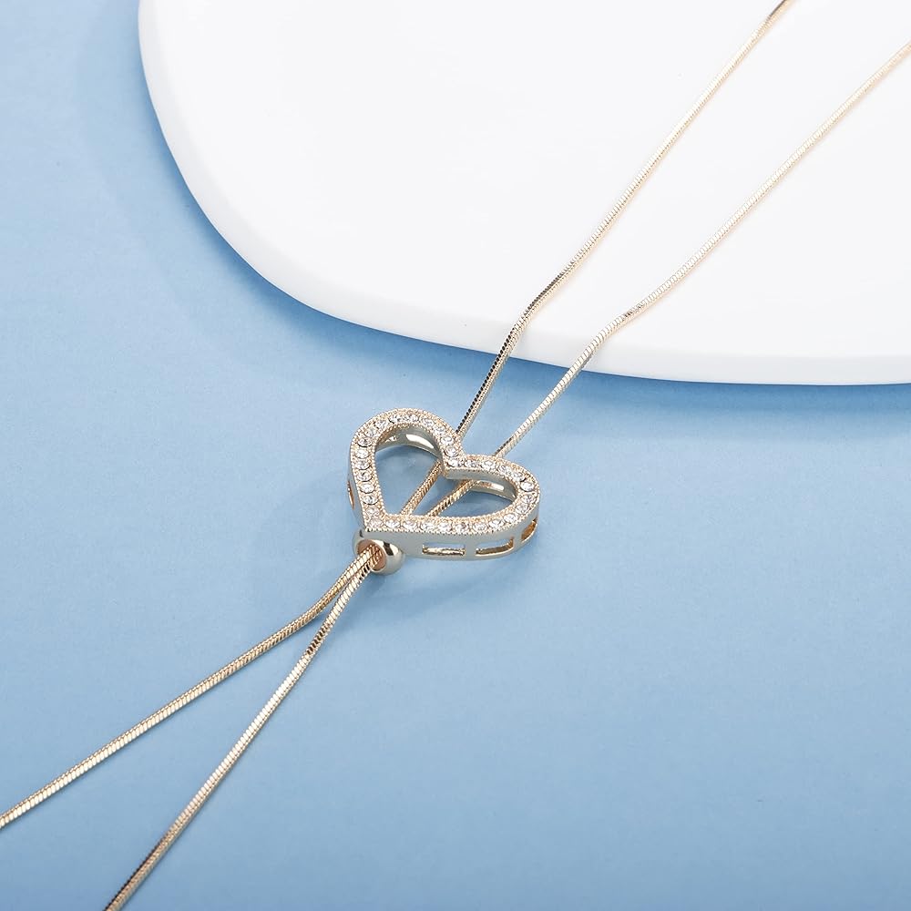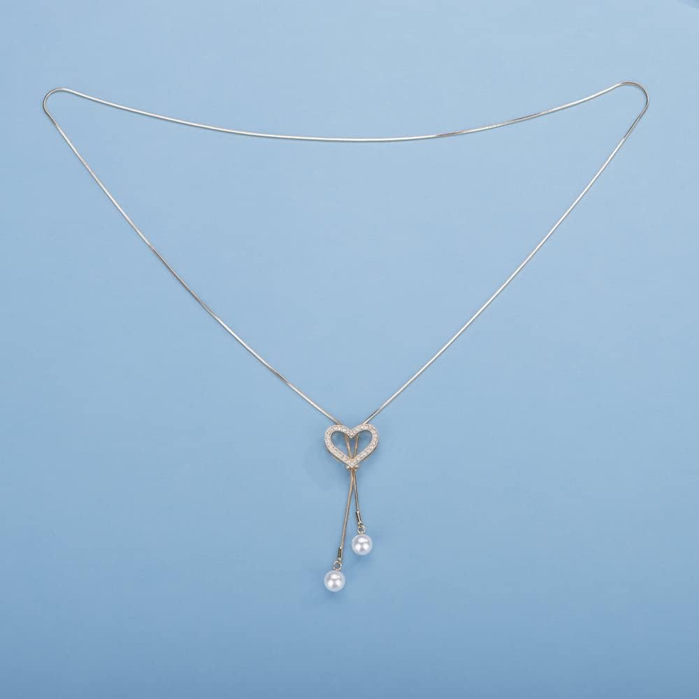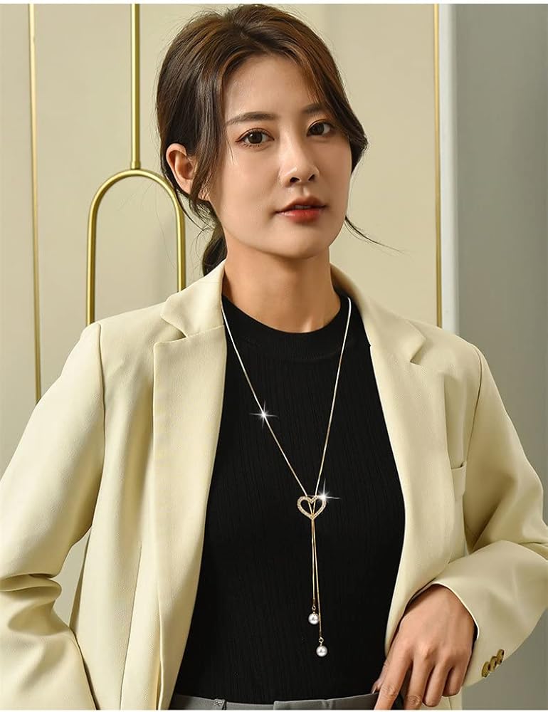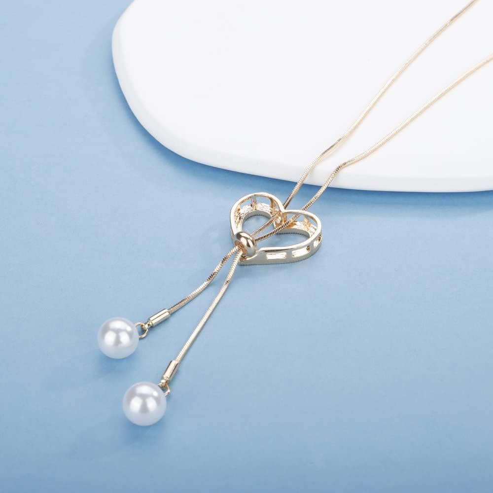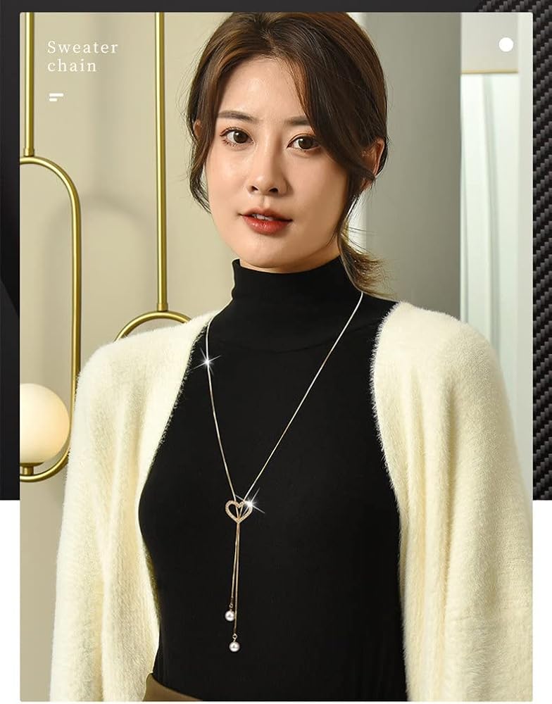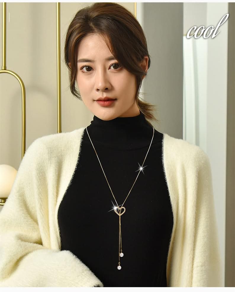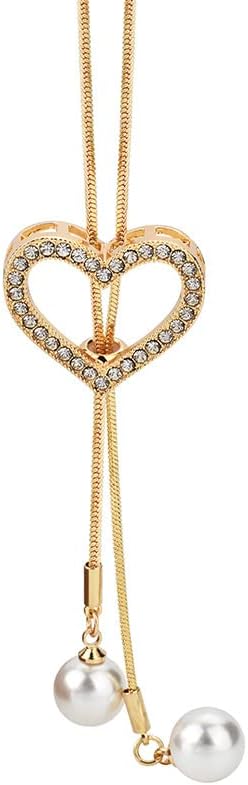 Sither Crystal Heart Necklace for Women Long Pearls Tassel Sweater Chain Necklace Wedding Dressy Necklace Jewelry for Winter Evening Party Christmas Gift (gold)