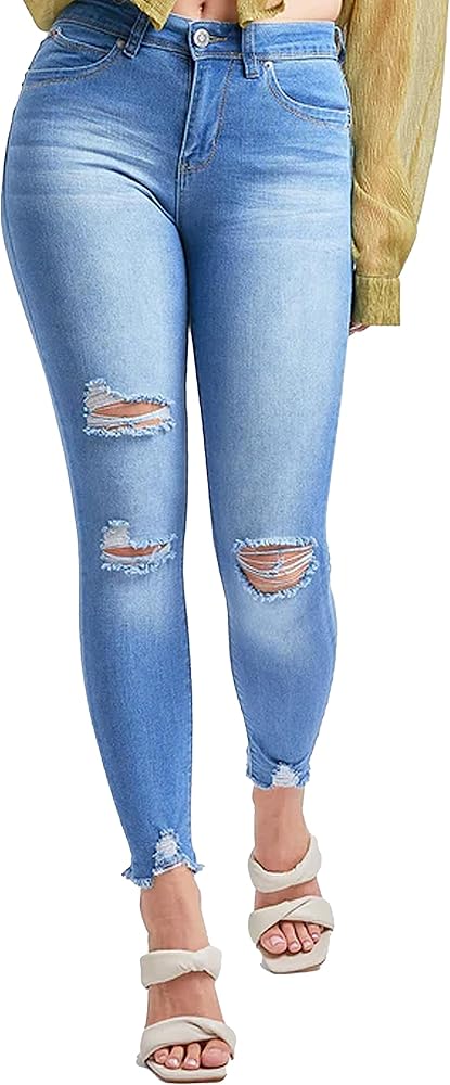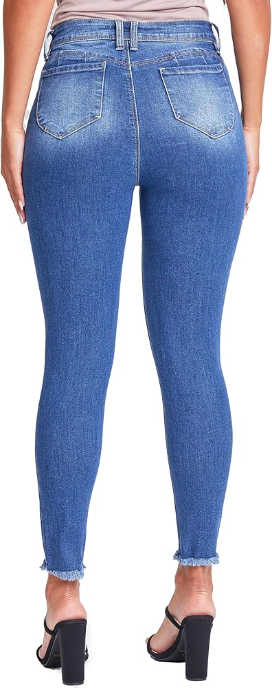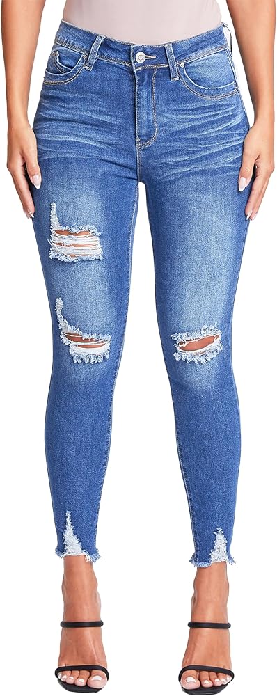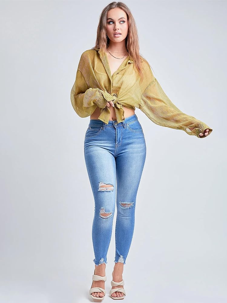 Elevate your denim game with our YMI Junior Women's WannaBettaButt Mid-Rise Sustainable Distressed Ankle Jeans. The Wannabettabutt collection showcases our unique heart-shaped butt stitching, designed to highlight your natural features and lift your bum, while our carefully crafted pockets accentuate your curves. Our sustainable fabric, made from recycled microfibers, combines comfort and stretch, making it perfect for any occasion. These mid-rise skinny jeans offer a timeless and effortless style, fitting snugly in all the right places and giving you that coveted hourglass look. Whether you're going for a casual look with a classic white tee or aiming for an elevated style with a corset and heels, our jeans offer both comfort and style, accentuating your natural beauty. Our denim is not only fashion-forward but also eco-friendly. It's made from recycled plastic bottles and features LYCRA fiber for flexibility and comfort. Care is a breeze; simply toss them in the washing machine. Get ready to look great, feel comfortable, and support sustainable fashion with YMI. Our Women's WannaBettaButt Ankle Jeans are not just jeans; they're a statement of style and eco-consciousness.